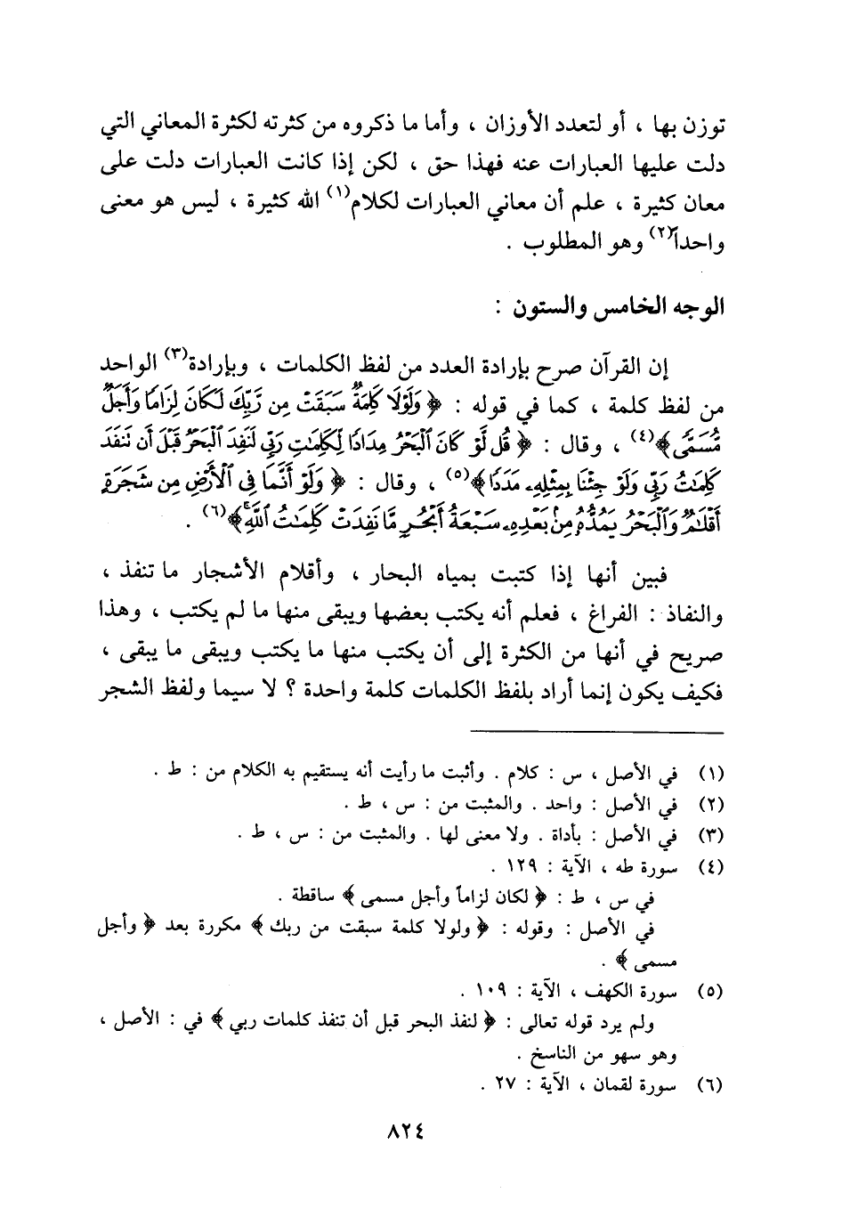 إن القرآن صرح بإرادة العدد من لفظ الكلمات، وبإرادة (¬3) الواحد من لفظ كلمة، كما في قوله: {وَلَوْلَا كَلِمَةٌ سَبَقَتْ مِنْ رَبِّكَ لَكَانَ لِزَامًا وَأَجَلٌ مُسَمًّى} (¬4)، وقال: {قُلْ لَوْ كَانَ الْبَحْرُ مِدَادًا لِكَلِمَاتِ رَبِّي لَنَفِدَ الْبَحْرُ قَبْلَ أَنْ تَنْفَدَ كَلِمَاتُ رَبِّي وَلَوْ جِئْنَا بِمِثْلِهِ مَدَدًا} (¬5)، وقال: {وَلَوْ أَنَّمَا فِي الْأَرْضِ مِنْ شَجَرَةٍ أَقْلَامٌ وَالْبَحْرُ يَمُدُّهُ مِنْ بَعْدِهِ سَبْعَةُ أَبْحُرٍ مَا نَفِدَتْ كَلِمَاتُ اللَّهِ} (¬6).