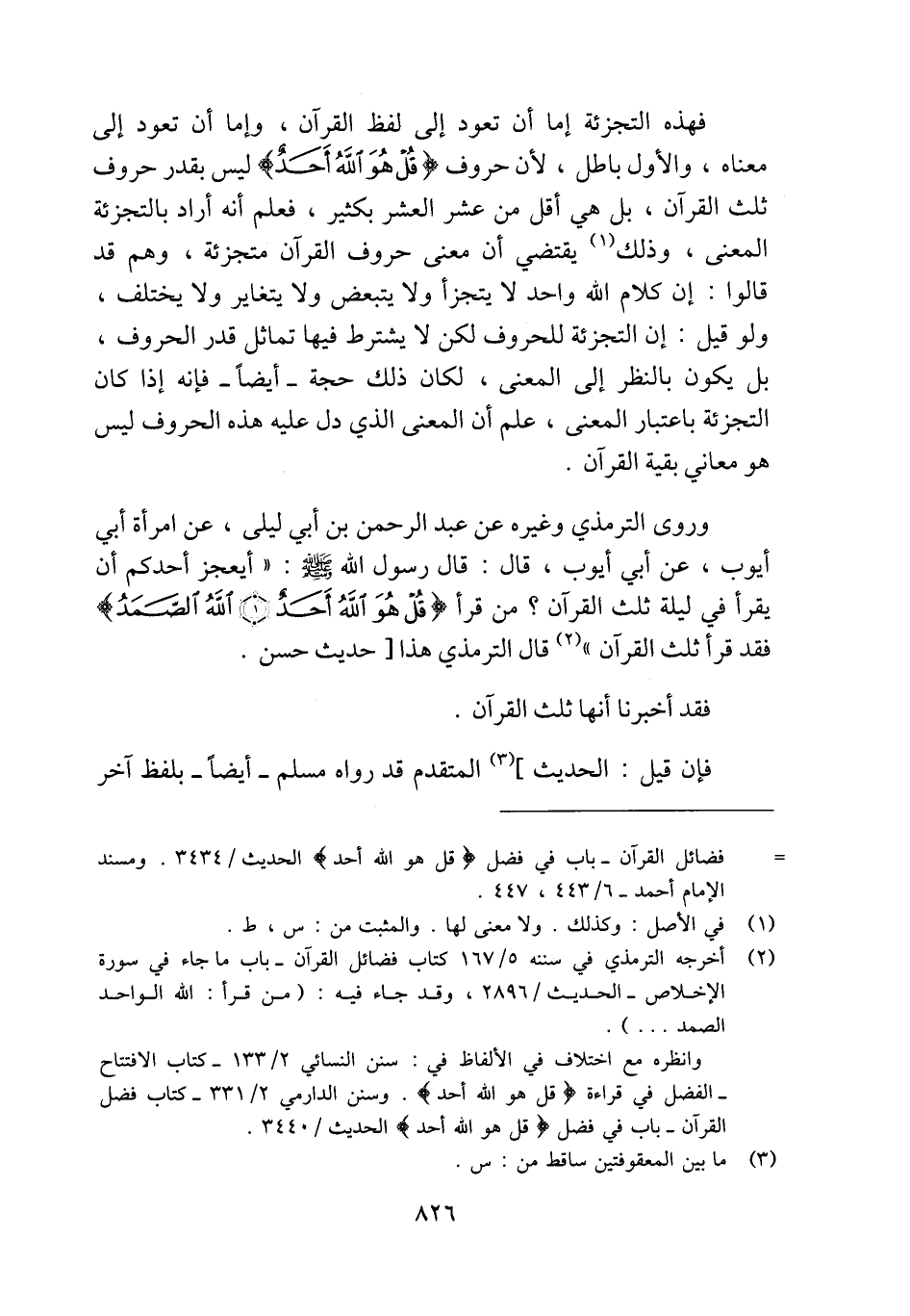فهذه التجزئة إما أن تعود إلى لفظ القرآن، وإما أن تعود إلى معناه، والأول باطل، لأن حروف {قُلْ هُوَ اللَّهُ أَحَدٌ} ليس بقدر حروف ثلث القرآن، بل هي أقل من عشر العشر بكثير، فعلم أنه أراد بالتجزئة المعنى، وذلك (¬1) يقتضي أن معنى حروف القرآن متجزئة، وهم قد قالوا: إن كلام الله واحد لا يتجزأ ولا يتبعض ولا يتغاير ولا يختلف، ولو قيل: إن التجزئة للحروف لكن لا يشترط فيها تماثل قدر الحروف، بل يكون بالنظر إلى المعنى، لكان ذلك حجة -أيضًا- فإنه إذا كان التجزئة باعتبار المعنى، علم أن المعنى الذي دل عليه هذه الحروف ليس هو معاني بقية القرآن.