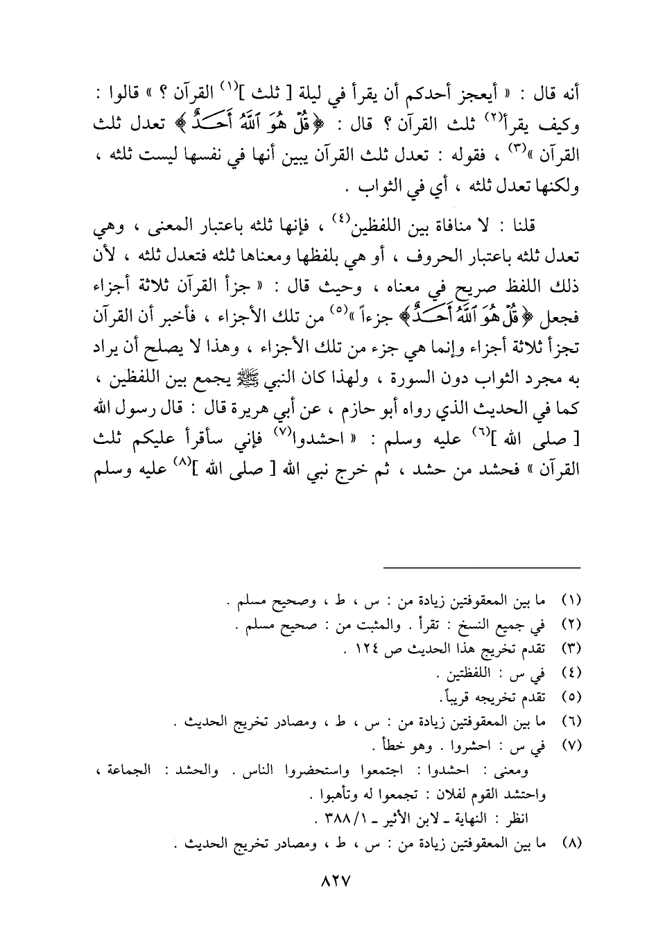 قلنا: لا منافاة بين اللفظين (¬4)، فإنها ثلثه باعتبار المعنى، وهي تعدل ثلثه باعتبار الحروف، أو هي بلفظها ومعناها ثلثه فتعدل ثلثه، لأن ذلك اللفظ صريح في معناه، وحيث قال: "جزأ القرآن ثلاثة أجزاء فجعل {قُلْ هُوَ اللَّهُ أَحَدٌ} جزءًا" (¬5) من تلك الأجزاء، فأخبر أن القرآن تجزأ ثلاثة أجزاء وإنما هي جزء من تلك الأجزاء، وهذا لا يصلح أن يراد به مجرد الثواب دون السورة، ولهذا كان النبي - صلى الله عليه وسلم - يجمع بين اللفظين، كما في الحديث الذي رواه أبو حازم، عن أبي هريرة قال: قال رسول الله [صلى الله] (¬6) عليه وسلم: "احشدوا (¬7) فإني سأقرأ عليكم ثلث القرآن" فحشد من حشد، ثم خرج نبي الله [صلى الله] (¬8) عليه وسلم