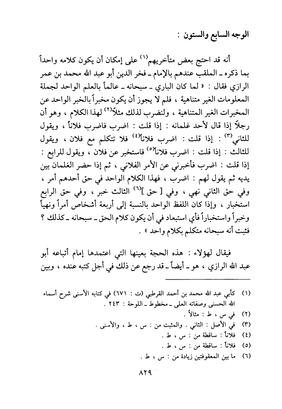 أنه قد احتج بعض متأخريهم (¬1) على إمكان أن يكون كلامه واحدًا بما ذكره -الملقب عندهم بالإمام- فخر الدين أبو عبد الله محمد بن عمر الرازي فقال: "لما كان الباري -سبحانه- عالمًا بالعلم الواحد لجملة المعلومات الغير متناهية، فلم لا يجوز أن يكون مخبرًا بالخبر الواحد عن المخبرات الغير المتناهية، ولنضرب لذلك مثلًا (¬2) لهذا الكلام، وهو أن رجلًا إذا قال لأحد غلمانه: إذا قلت: اضرب فاضرب فلانًا، ويقول للثاني (¬3): إذا قلت: اضرب فلانًا (¬4) فلا تتكلم مع فلان، ويقول للثالث: إذا قلت: اضرب فلانًا (¬5) فاستخبر عن فلان، ويقول للرابع: إذا قلت: اضرب فأخبرني عن الأمر الفلاني، ثم إذا حضر الغلمان بين يديه ثم يقول لهم: اضرب، فهذا الكلام الواحد في حق أحدهم أمر، وفي حق الثاني نهي، وفي [حق] (¬6) الثالث خبر، وفي حق الرابع استخبار، وإذا كان اللفظ الواحد بالنسبة إلى أربعة أشخاص أمرًا ونهيًا وخبرًا واستخبارًا فأي استبعاد في أن يكون كلام الحق -سبحانه- كذلك؟ فثبت أنه سبحانه متكلم بكلام واحد".