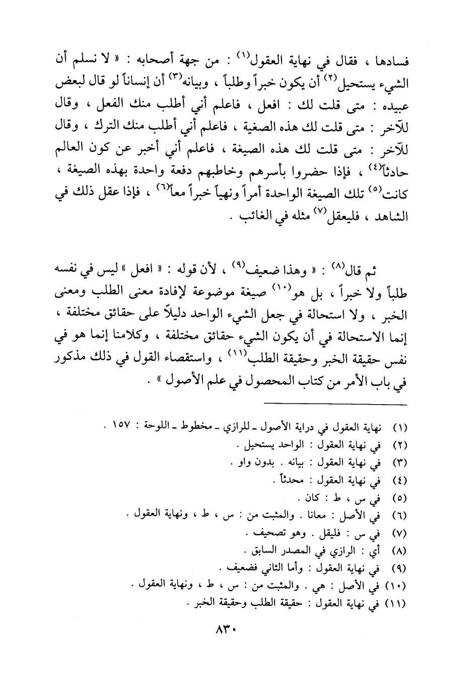 (¬11) في نهاية العقول: حقيقة الطلب وحقيقة الخبر.