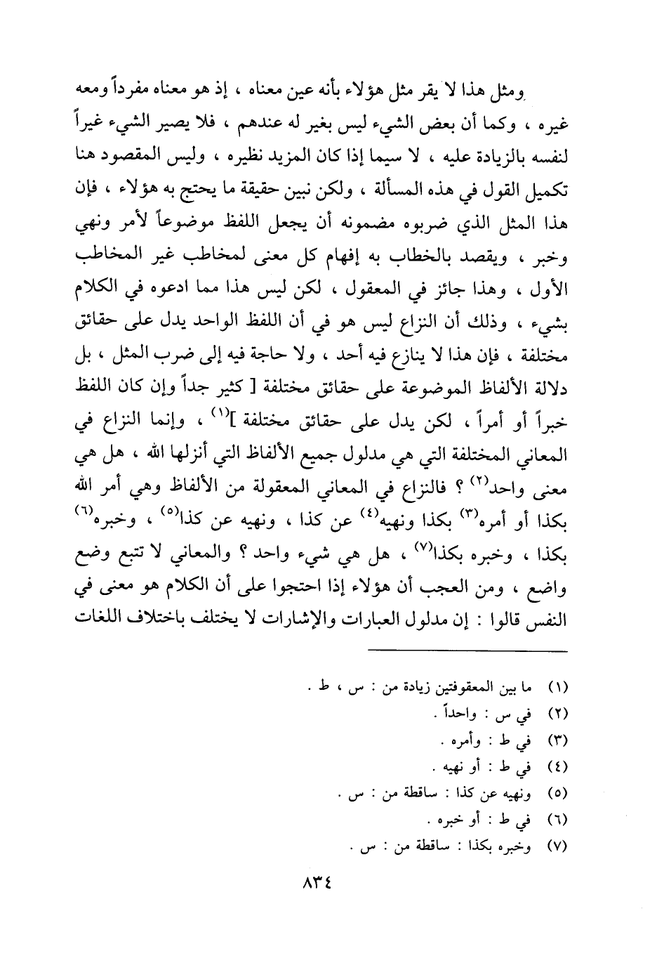 ومثل هذا لا يقر مثل هؤلاء بأنه عين معناه، إذ هو معناه مفردًا ومعه غيره، وكما أن بعض الشيء ليس بغير له عندهم، فلا يصير الشيء غيرًا لنفسه بالزيادة عليه، لا سيما إذا كان المزيد نظيره، وليس المقصود هنا تكميل القول في هذه المسألة، ولكن نبين حقيقة ما يحتج به هؤلاء، فإن هذا المثل الذي ضربوه مضمونه أن يجعل اللفظ موضوعًا لأمر ونهي وخبر، ويقصد بالخطاب به إفهام كل معنى لمخاطب غير المخاطب الأول، وهذا جائز في المعقول، لكن ليس هذا مما ادعوه في الكلام بشيء، وذلك أن النزاع ليس هو في أن اللفظ الواحد يدل على حقائق مختلفة، فإن هذا لا ينازع فيه أحد، ولا حاجة فيه إلى ضرب المثل، بل دلالة الألفاظ الموضوعة على حقائق مختلفة [كثير جدًّا وإن كان اللفظ خبرًا أو أمرًا، لكن يدل على حقائق مختلفة] (¬1)، وإنما النزاع في المعاني المختلفة التي هي مدلول جميع الألفاظ التي أنزلها الله، هل هي معنى واحد (¬2)؟ فالنزاع في المعاني المعقولة من الألفاظ وهي أمر الله بكذا أو أمره (¬3) بكذا ونهيه (¬4) عن كذا، ونهيه عن كذا (¬5)، وخبره (¬6) بكذا، وخبره بكذا (¬7)، هل هي شيء واحد؟ والمعاني لا تتبع وضع واضع، ومن العجب أن هؤلاء إذا احتجوا على أن الكلام هو معنى في النفس قالوا: إن مدلول العبارات والإشارات لا يختلف باختلاف اللغات