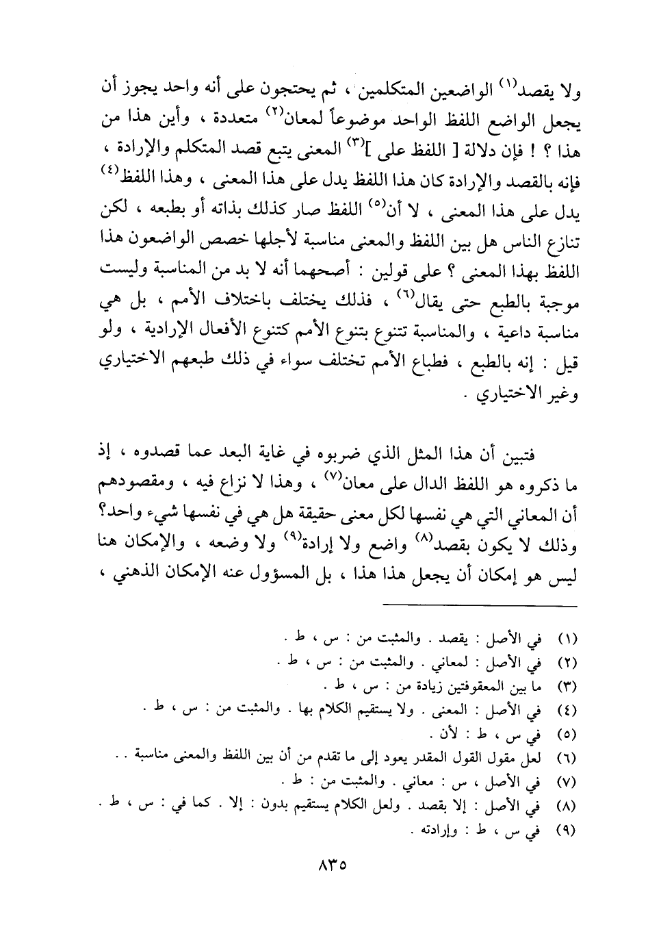 ولا يقصد (¬1) الواضعين المتكلمين، ثم يحتجون على أنه واحد يجوز أن يجعل الواضع اللفظ الواحد موضوعًا لمعان (¬2) متعددة، وأين هذا من هذا؟! فإن دلالة [اللفظ على] (¬3) المعنى يتبع قصد المتكلم والإرادة، فإنه بالقصد والإرادة كان هذا اللفظ يدل على هذا المعنى، وهذا اللفظ (¬4) يدل على هذا المعنى، لا أن (¬5) اللفظ صار كذلك بناته أو بطبعه، لكن تنازع الناس هل بين اللفظ والمعنى مناسبة لأجلها خصص الواضعون هذا اللفظ بهذا المعنى؟ على قولين: أصحهما أنه لا بد من المناسبة وليست موجبة بالطبع حتى يقال (¬6)، فذلك يختلف باختلاف الأمم، بل هي مناسبة داعية، والمناسبة تتنوع بتنوع الأمم كتنوع الأفعال الإرادية، ولو قيل: إنه بالطبع، فطباع الأمم تختلف سواء في ذلك طبعهم الاختياري وغير الاختياري.