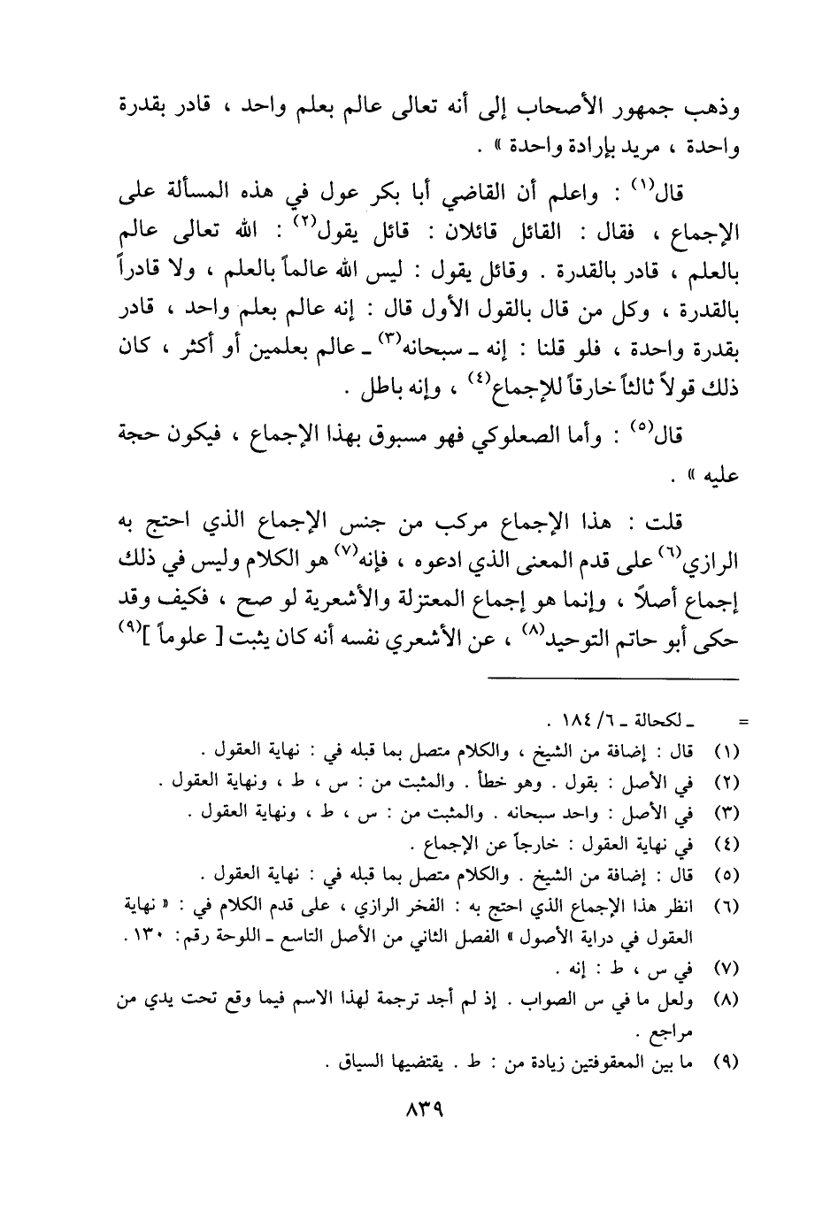 قلت: هذا الإجماع مركب من جنس الإجماع الذي احتج به الرازي (¬6) على قدم المعنى الذي ادعوه، فإنه (¬7) هو الكلام وليس في ذلك إجماع أصلًا، وإنما هو إجماع المعتزلة والأشعرية لو صح، فكيف وقد حكى أبو حاتم التوحيد (¬8)، عن الأشعري نفسه أنه كان يثبت [علومًا] (¬9)