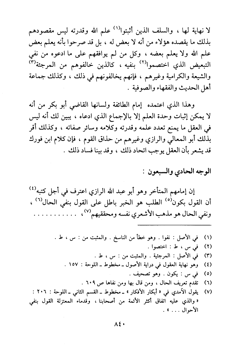 (¬7) يقول الآمدي في "أبكار الأفكار" -مخطوط- القسم الثاني- اللوحة: 206: "والذي عليه اتفاق أكثر الأئمة من أصحابنا، وقدماء المعتزلة القول بنفي الأحوال. . . ".