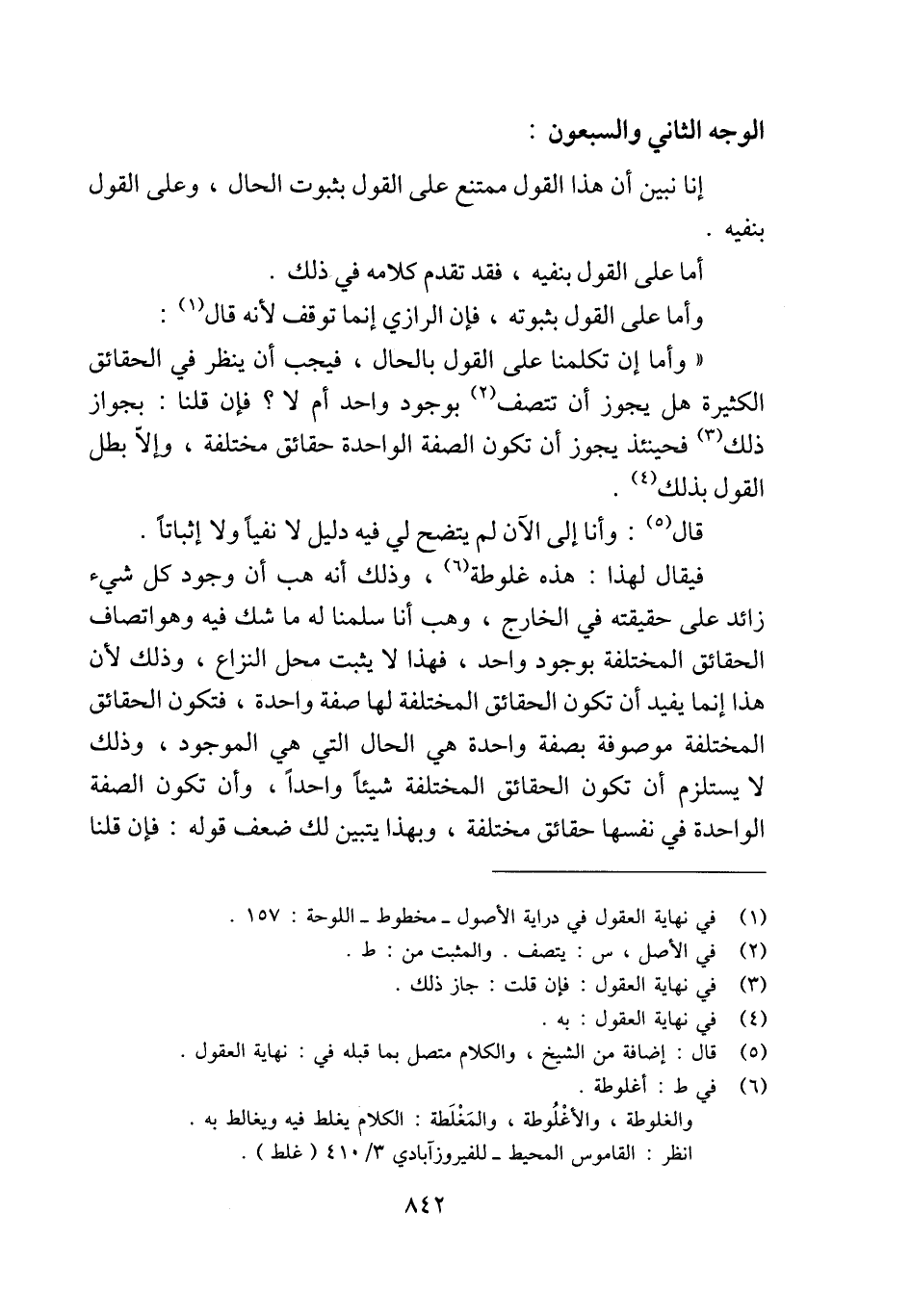"وأما إن تكلمنا على القول بالحال، فيجب أن ينظر في الحقائق الكثيرة هل يجوز أن تتصف (¬2) بوجود واحد أم لا؟ فإن قلنا: بجواز ذلك (¬3) فحينئذ يجوز أن تكون الصفة الواحدة حقائق مختلفة، وإلّا بطل القول بذلك (¬4).