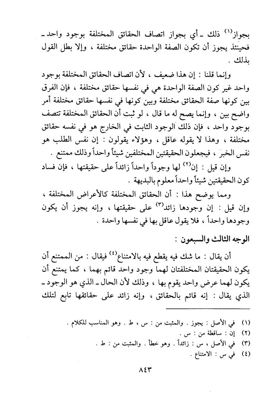 ومما يوضح هذا: أن الحقائق المختلفة كالأعراض المختلفة، وإن قيل: إن وجودها زائد (¬3) على حقيقتها، وإنه يجوز أن يكون وجودها واحدًا، فلا يقول عاقل بها في نفسها واحدة.
