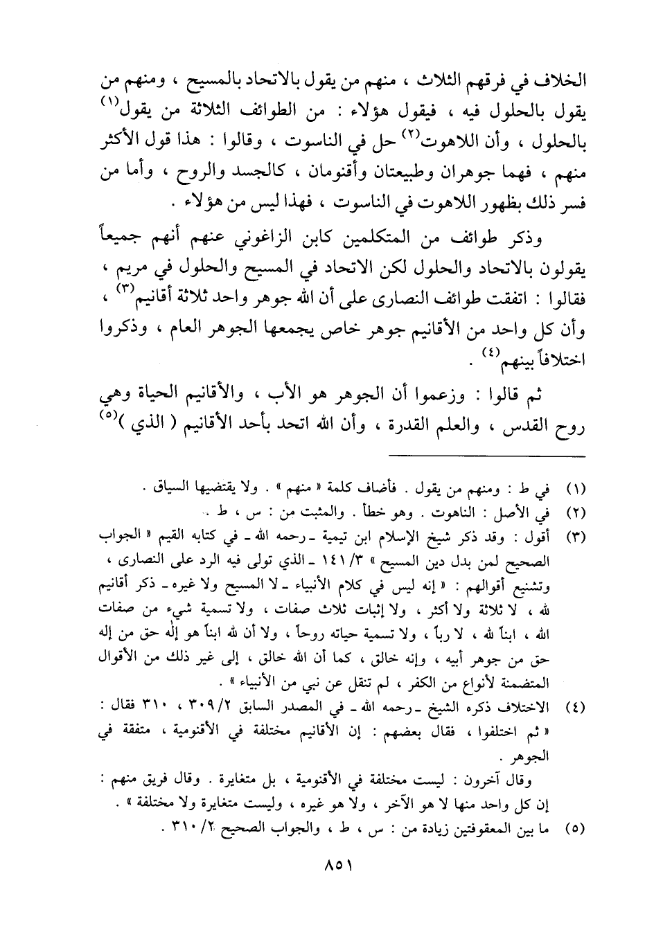 (¬4) الاختلاف ذكره الشيخ -رحمه الله- في المصدر السابق 2/ 309، 310 فقال: "ثم اختلفوا، فقال بعضهم: إن الأقانيم مختلفة في الأقنومية، متفقة في الجوهر.