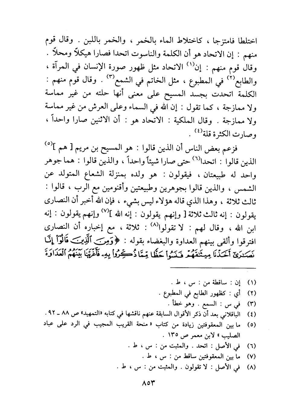 فزعم بعض الناس أن الذين قالوا: هو المسيح بن مريم [هم] (¬5) الذين قالوا: اتحدا (¬6) حتى صارا شيئًا واحدًا، والذين قالوا: هما جوهر واحد له طبيعتان، فيقولون: هو ولده بمنزلة الشعاع المتولد عن الشمس، والذين قالوا بجوهرين وطبيعتين وأقنومين مع الرب، قالوا: ثالث ثلاثة، وهذا الذي قاله هؤلاء ليس بشيء، فإن الله أخبر أن النصارى يقولون: إنه ثالث ثلاثة [وإنهم يقولون: إنه الله] (¬7) وإنهم يقولون: إنه ابن الله، وقال لهم: لا تقولوا (¬8): ثلاثة، مع إخباره أن النصارى افترقوا وألقى بينهم العداوة والبغضاء بقوله: {وَمِنَ الَّذِينَ قَالُوا إِنَّا نَصَارَى أَخَذْنَا مِيثَاقَهُمْ فَنَسُوا حَظًّا مِمَّا ذُكِّرُوا بِهِ فَأَغْرَيْنَا بَيْنَهُمُ الْعَدَاوَةَ