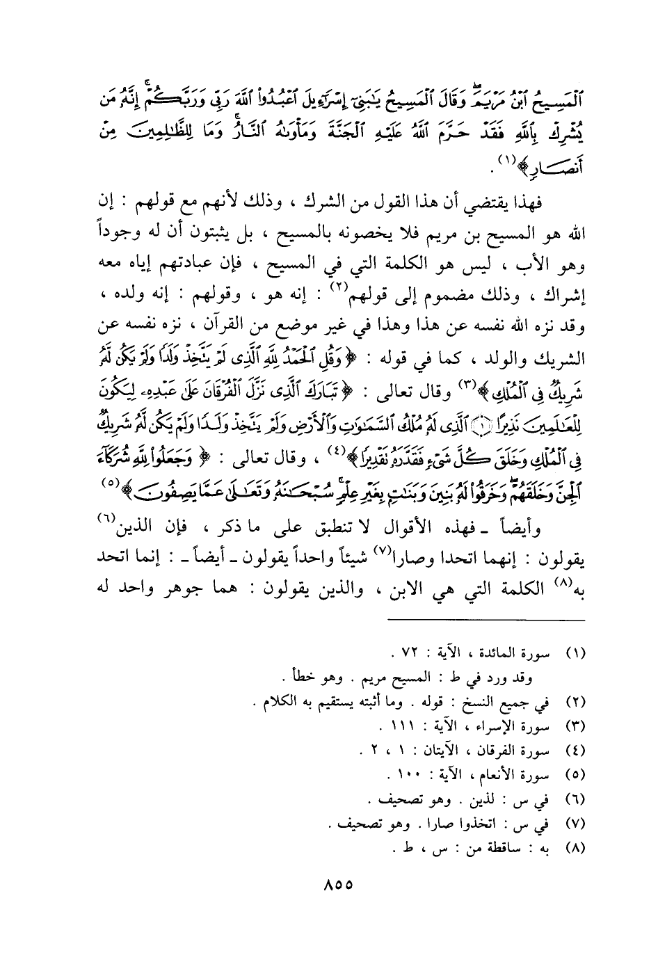 فهذا يقتضي أن هذا القول من الشرك، وذلك لأنهم مع قولهم: إن الله هو المسيح بن مريم فلا يخصونه بالمسيح، بل يثبتون أن له وجودًا وهو الأب، ليس هو الكلمة التي في المسيح، فإن عبادتهم إياه معه إشراك، وذلك مضموم إلى قولهم (¬2): إنه هو، وقولهم: إنه ولده، وقد نزه الله نفسه عن هذا وهذا في غير موضع من القرآن، نزه نفسه عن الشريك والولد، كما في قوله: {وَقُلِ الْحَمْدُ لِلَّهِ الَّذِي لَمْ يَتَّخِذْ وَلَدًا وَلَمْ يَكُنْ لَهُ شَرِيكٌ فِي الْمُلْكِ} (¬3) وقال تعالى: {تَبَارَكَ الَّذِي نَزَّلَ الْفُرْقَانَ عَلَى عَبْدِهِ لِيَكُونَ لِلْعَالَمِينَ نَذِيرًا (1) الَّذِي لَهُ مُلْكُ السَّمَاوَاتِ وَالْأَرْضِ وَلَمْ يَتَّخِذْ وَلَدًا وَلَمْ يَكُنْ لَهُ شَرِيكٌ فِي الْمُلْكِ وَخَلَقَ كُلَّ شَيْءٍ فَقَدَّرَهُ تَقْدِيرًا} (¬4)، وقال تعالى: {وَجَعَلُوا لِلَّهِ شُرَكَاءَ الْجِنَّ وَخَلَقَهُمْ وَخَرَقُوا لَهُ بَنِينَ وَبَنَاتٍ بِغَيْرِ عِلْمٍ سُبْحَانَهُ وَتَعَالَى عَمَّا يَصِفُونَ} (¬5) وأيضًا -فهذه الأقوال لا تنطبق على ما ذكر، فإن الذين (¬6) يقولون: إنهما اتحدا وصارا (¬7) شيئًا واحدًا يقولون -أيضًا-: إنما اتحد به (¬8) الكلمة التي هي الابن، والذين يقولون: هما جوهر واحد له