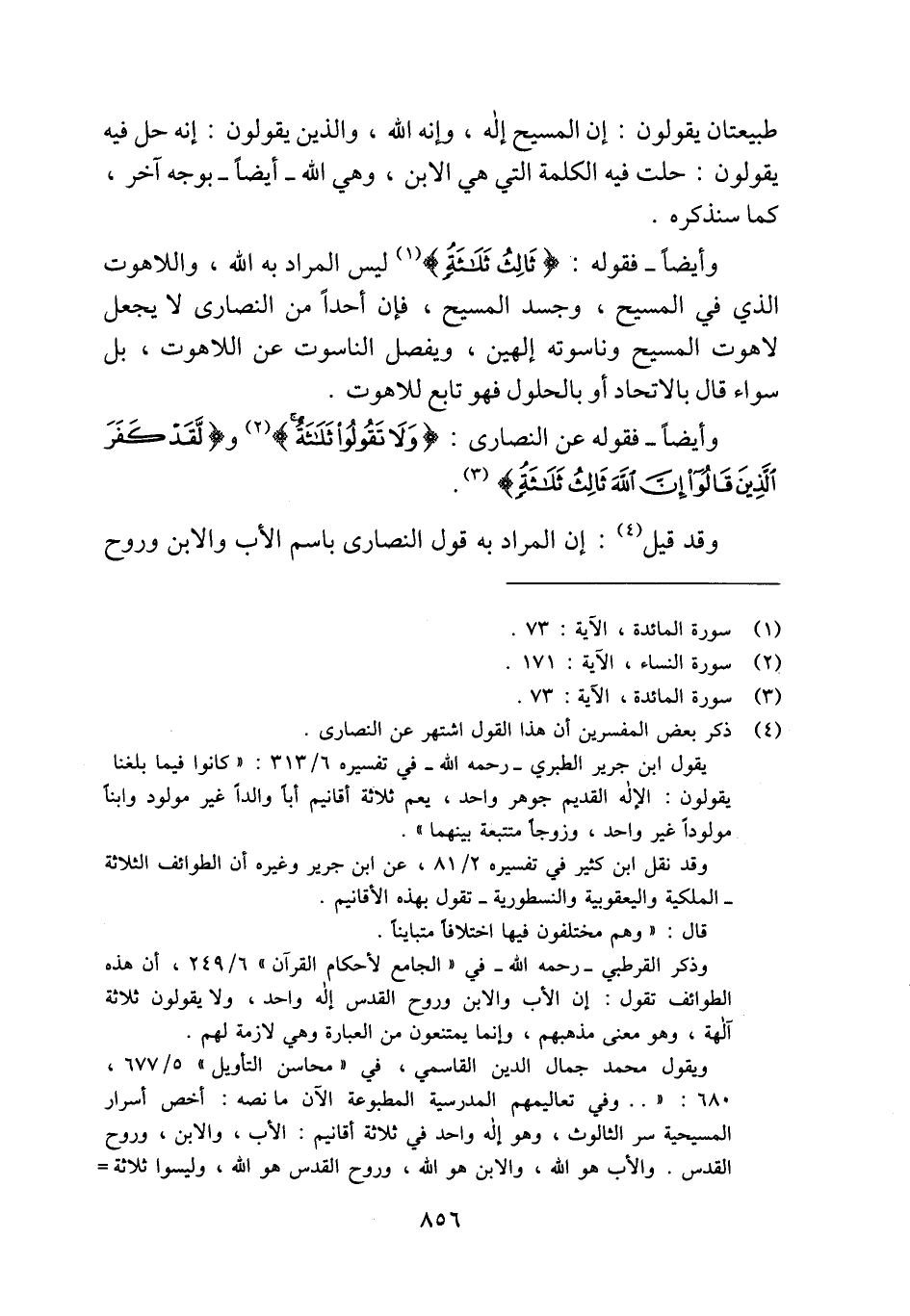 ويقول محمد جمال الدين القاسمي، في "محاسن التأويل" 5/ 677، 680: ". . وفي تعاليمهم المدرسية المطبوعة الآن ما نصه: أخص أسرار المسيحية سر الثالوث، وهو إله واحد في ثلاثة أقانيم: الأب، والابن، وروح القدس. والأب هو الله، والابن هو الله، وروح القدس هو الله، وليسوا ثلاثة =