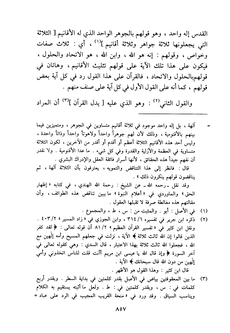 القدس إله واحد، وهو قولهم بالجوهر الواحد الذي له الأقانيم [الثلاثة التي يجعلونها ثلاثة جواهر وثلاثة أقانيم] (¬1)، أي: ثلاث صفات وخواص، وقولهم: إنه هو الله، وابن الله، هو الاتحاد والحلول، فيكون على هذا تلك الآية على قولهم تثليث الأقانيم، وهاتان في قولهم بالحلول والاتحاد، فالقرآن على هذا القول رد في كل آية بعض قولهم، كما أنه على القول الأول في كل آية على صنف منهم.