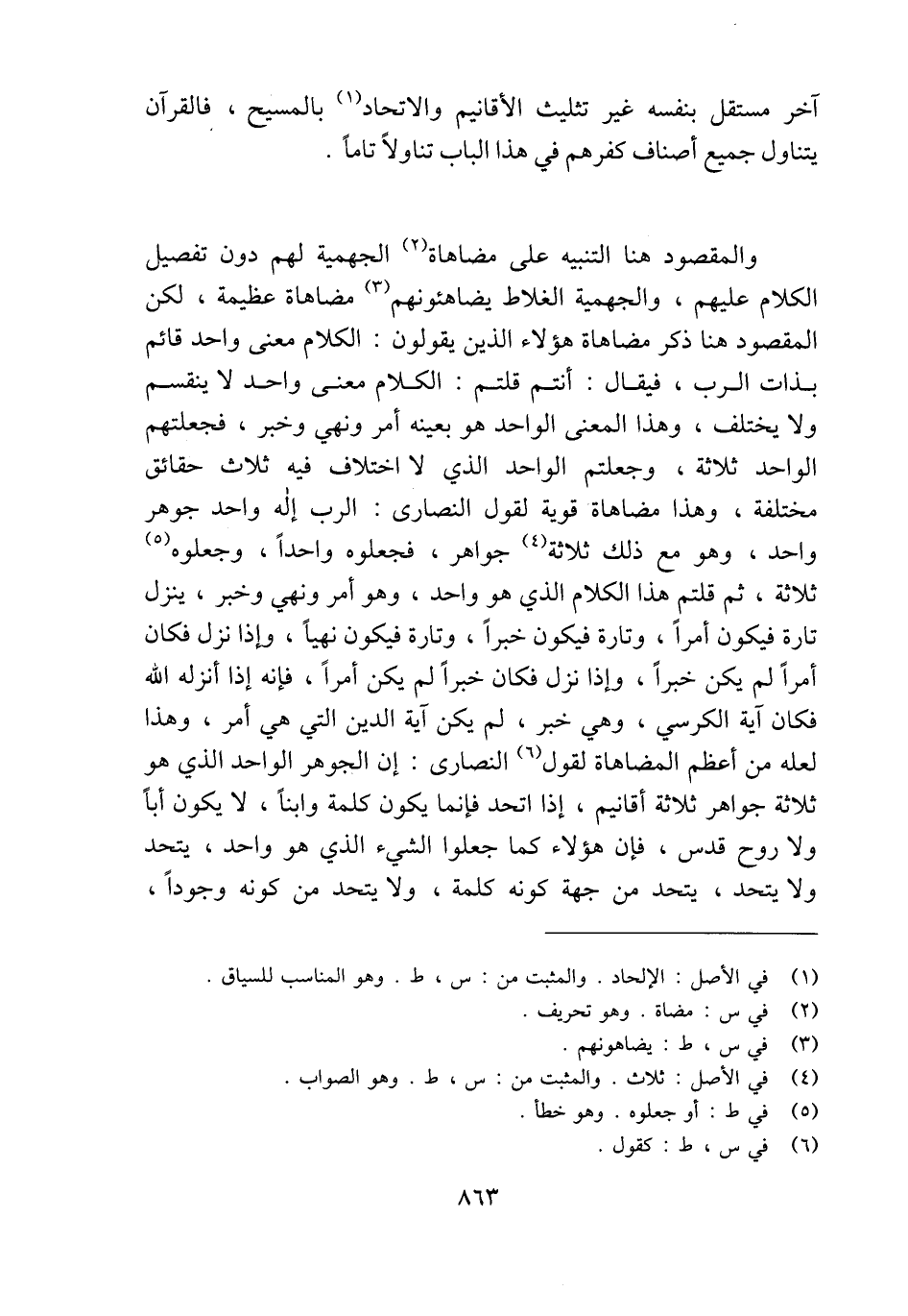 والمقصود هنا التنبيه على مضاهاة (¬2) الجهمية لهم دون تفصيل الكلام عليهم، والجهمية الغلاط يضاهئونهم (¬3) مضاهاة عظيمة، لكن المقصود هنا ذكر مضاهاة هؤلاء الذين يقولون: الكلام معنى واحد قائم بذات الرب، فيقال: أنتم قلتم: الكلام معنى واحد لا ينقسم ولا يختلف، وهذا المعنى الواحد هو بعينه أمر ونهي وخبر، فجعلتهم الواحد ثلاثة، وجعلتم الواحد الذي لا اختلاف فيه ثلاث حقائق مختلفة، وهذا مضاهاة قوية لقول النصارى: الرب إله واحد جوهر واحد، وهو مع ذلك ثلاثة (¬4) جواهر، فجعلوه واحدًا، وجعلوه (¬5) ثلاثة، ثم قلتم هذا الكلام الذي هو واحد، وهو أمر ونهي وخبر، ينزل تارة فيكون أمرًا، وتارة فيكون خبرًا، وتارة فيكون نهيًا، وإذا نزل فكان أمرًا لم يكن خبرًا، وإذا نزل فكان خبرًا لم يكن أمرًا، فإنه إذا أنزله الله فكان آية الكرسي، وهي خبر، لم يكن آية الدين التي هي أمر، وهذا لعله من أعظم المضاهاة لقول (¬6) النصارى: إن الجوهر الواحد الذي هو ثلاثة جواهر ثلاثة أقانيم، إذا اتحد فإنما يكون كلمة وابنًا، لا يكون أبًا ولا روح قدس، فإن هؤلاء كما جعلوا الشيء الذي هو واحد، يتحد ولا يتحد، يتحد من جهة كونه كلمة، ولا يتحد من كونه وجودًا،