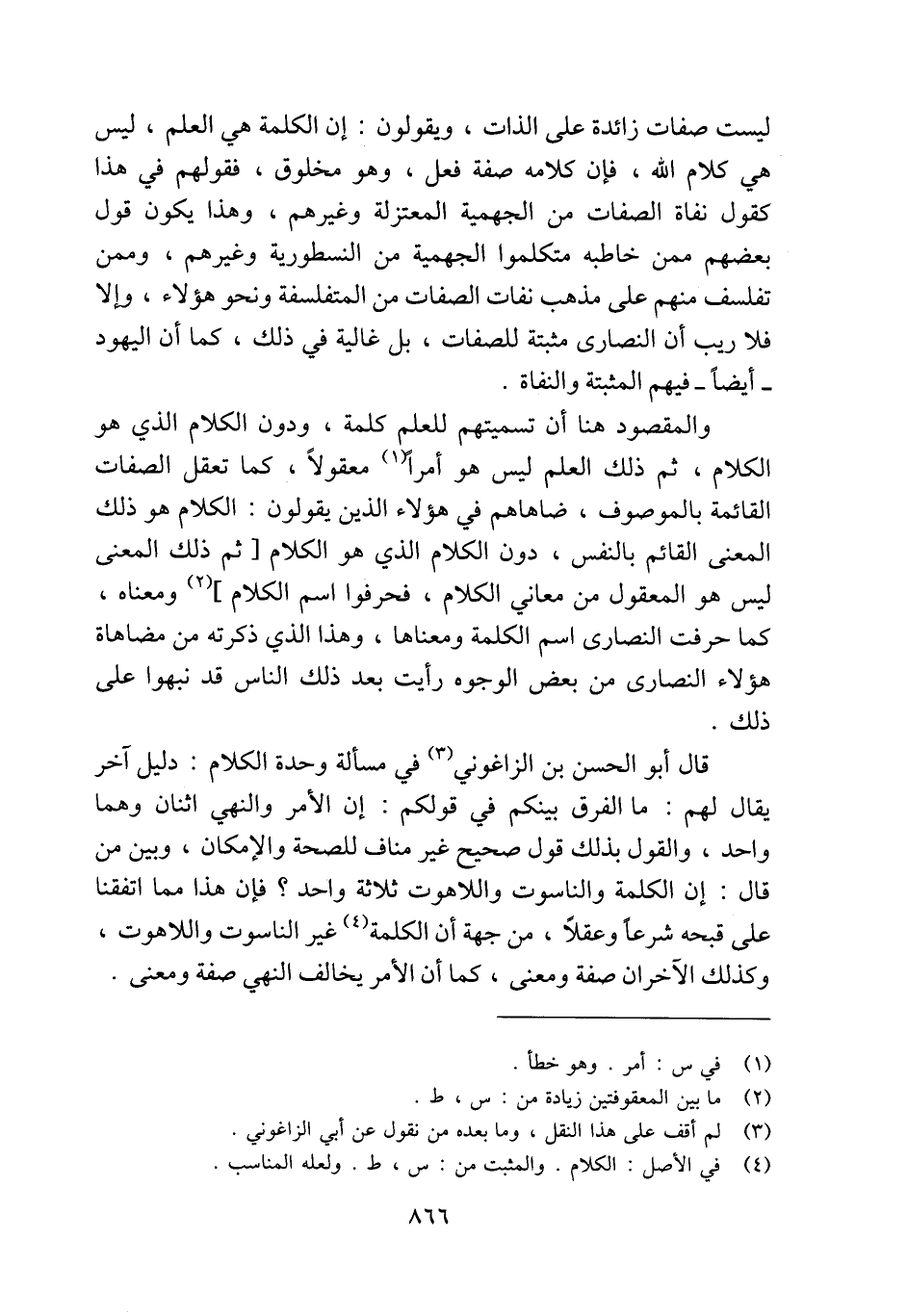 ليست صفات زائدة على الذات، ويقولون: إن الكلمة هي العلم، ليس هي كلام الله، فإن كلامه صفة فعل، وهو مخلوق، فقولهم في هذا كقول نفاة الصفات من الجهمية المعتزلة وغيرهم، وهذا يكون قول بعضهم ممن خاطبه متكلموا الجهمية من النسطورية وغيرهم، وممن تفلسف منهم على مذهب نفات الصفات من المتفلسفة ونحو هؤلاء، وإلا فلا ريب أن النصارى مثبتة للصفات، بل غالية في ذلك، كما أن اليهود -أيضًا- فيهم المثبتة والنفاة.