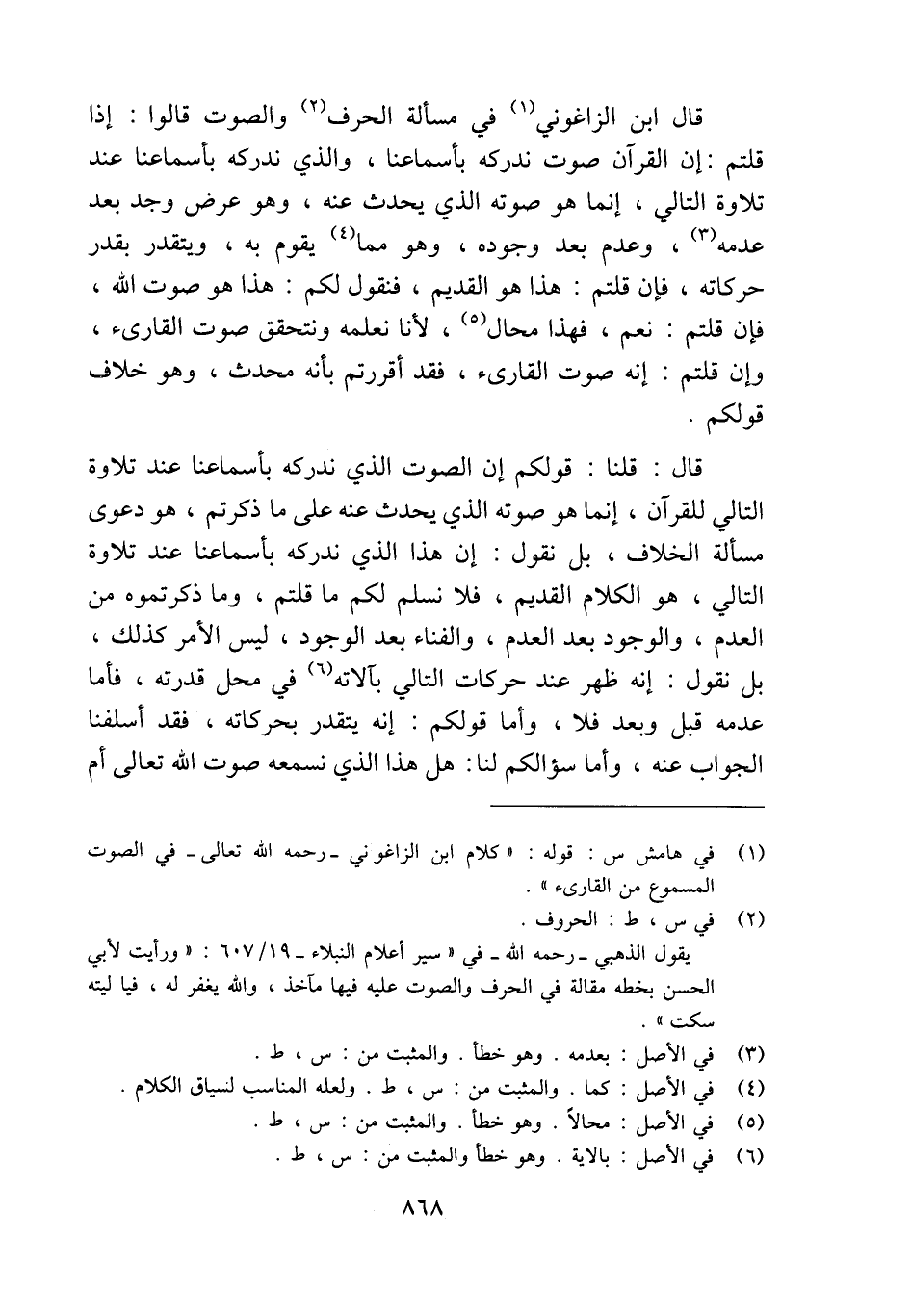 قال ابن الزاغوني (¬1) في مسألة الحرف (¬2) والصوت قالوا: إذا قلتم: إن القرآن صوت ندركه بأسماعنا، والذي ندركه بأسماعنا عند تلاوة التالي، إنما هو صوته الذي يحدث عنه، وهو عرض وجد بعد عدمه (¬3)، وعدم بعد وجوده، وهو مما (¬4) يقوم به، ويتقدر بقدر حركاته، فإن قلتم: هذا هو القديم، فنقول لكم: هذا هو صوت الله، فإن قلتم: نعم، فهذا محال (¬5)، لأنا نعلمه ونتحقق صوت القارئ، وإن قلتم: إنه صوت القارئ، فقد أقررتم بأنه محدث، وهو خلاف قولكم.