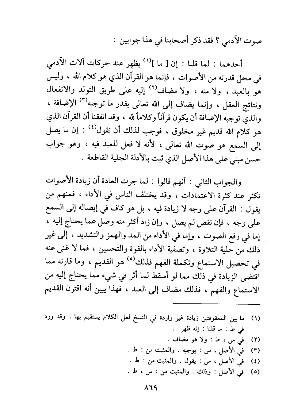 والجواب الثاني: أنهم قالوا: لما جرت العادة أن زيادة الأصوات تكثر عند كثرة الاعتمادات، وقد يختلف الناس في الأداء، فمنهم من يقول: القرآن على وجه لا زيادة فيه، بل هو كاف في إيصاله إلى السمع على وجه، فإن نقص لم يصل، وإن زاد أكثر منه وصل عما يحتاج إليه، إما في رفع الصوت، وإما في الأداء من المد والهمز والتشديد، إلى غير ذلك من حلية التلاوة، وتصفية الأداء بالقوة والتحسين، فما لا غنى عنه في تحصيل الاستماع وتكملة الفهم فذلك (¬5) هو القديم، وما قارنه مما اقتضى الزيادة في ذلك مما لو أسقط لما أثر في شيء مما يحتاج إليه من الاستماع والفهم، فذلك مضاف إلى العبد، فهذا يبين أنه اقترن القديم