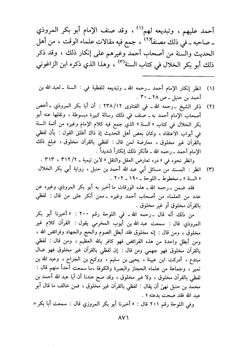 (¬3) انظر: المسند من مسائل أبي عبد الله أحمد بن حنبل، رواية أبي بكر الخلال "السنة"- مخطوط- اللوحة- 190 - 202.