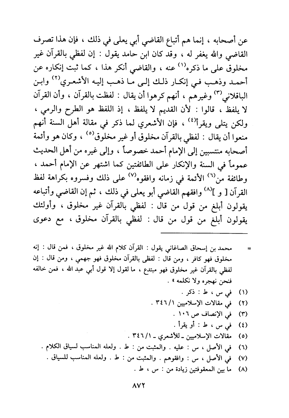 عن أصحابه، إنما هم أتباع القاضي أبي يعلى في ذلك، فإن هذا تصرف القاضي والله يغفر له، وقد كان ابن حامد يقول: إن لفظي بالقرآن غير مخلوق على ما ذكره (¬1) عنه، والقاضي أنكر هذا، كما ثبت إنكاره عن أحمد وذهب في إنكار ذلك إلى ما ذهب إليه الأشعري (¬2) وابن الباقلاني (¬3) وغيرهم، أنهم كرهوا أن يقال: لفظت بالقرآن، وأن القرآن لا يلفظ، قالوا: لأن القديم لا يلفظ، إذ اللفظ هو الطرح والرمي، ولكن يتلى ويقرأ (¬4)، فإن الأشعري لما ذكر في مقالة أهل السنة أنهم منعوا أن يقال: لفظي بالقرآن مخلوق أو غير مخلوق (¬5)، وكان هو وأئمة أصحابه منتسبين إلى الإمام أحمد خصوصًا، وإلى غيره من أهل الحديث عمومًا في السنة والإنكار على الطائفتين كما اشتهر عن الإمام أحمد، وطائفة من (¬6) الأئمة في زمانه وافقوه (¬7) على ذلك وفسروه بكراهة لفظ القرآن [و] (¬8) وافقهم القاضي أبو يعلى في ذلك، ثم إن القاضي وأتباعه يقولون أبلغ من قول من قال: لفظي بالقرآن غير مخلوق، وأولئك يقولون أبلغ من قول من قال: لفظي بالقرآن مخلوق، مع دعوى