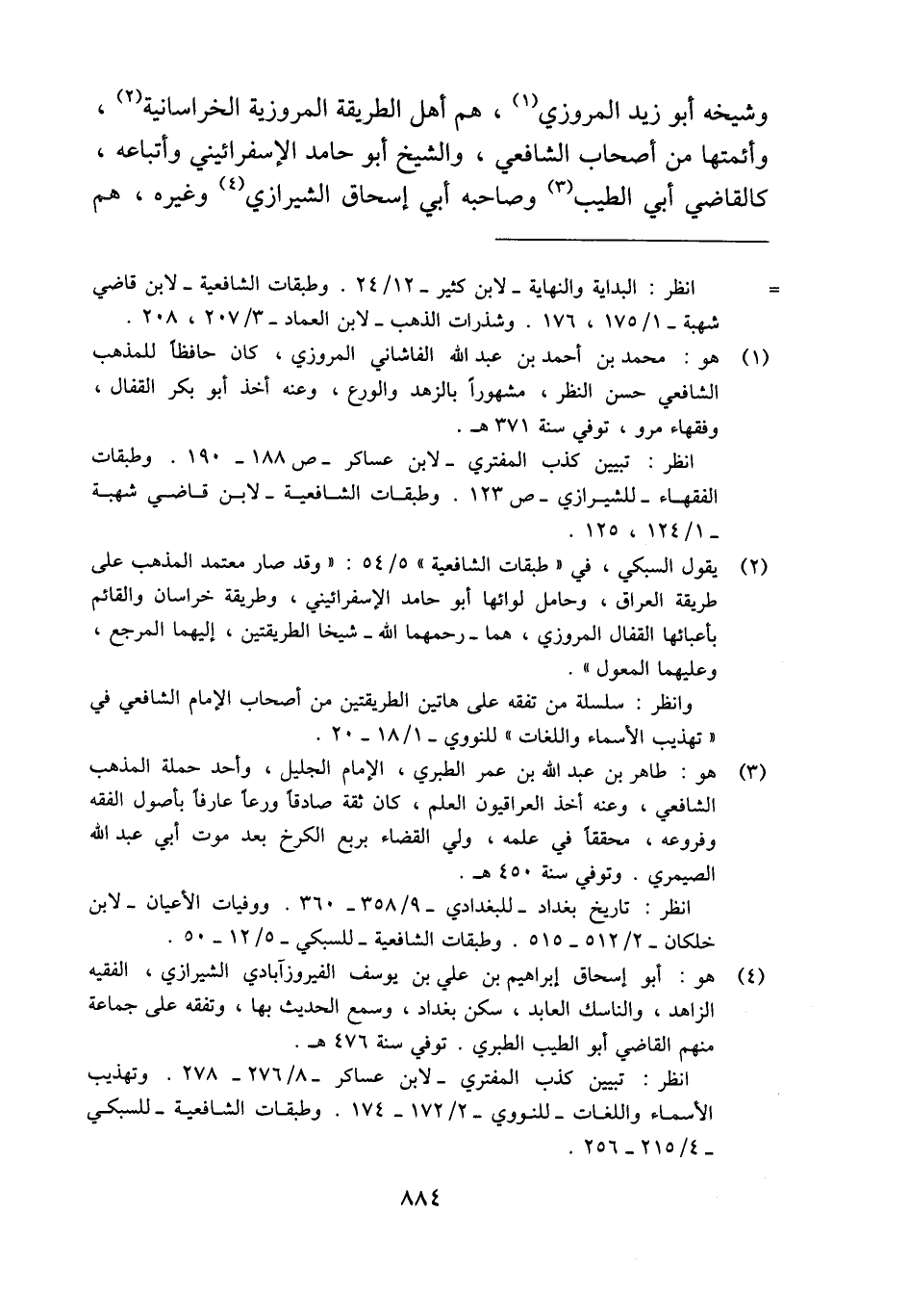 (¬4) هو: أبو إسحاق إبراهيم بن علي بن يوسف الفيروزآبادي الشيرازي، الفقيه الزاهد، والناسك العابد، سكن بغداد، وسمع الحديث بها، وتفقه على جماعة منهم القاضي أبو الطيب الطبري. توفي سنة 476 هـ.