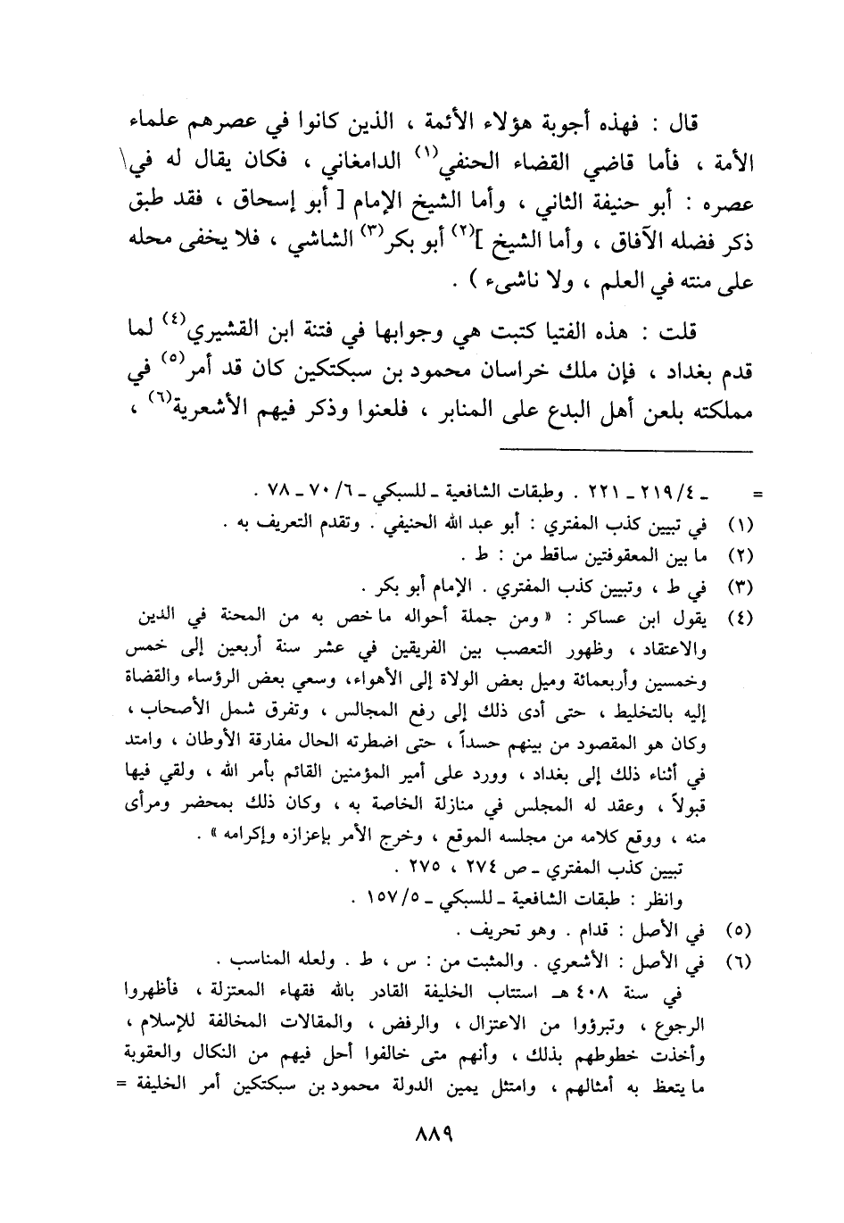قلت: هذه الفتيا كتبت هي وجوابها في فتنة ابن القشيري (¬4) لما قدم بغداد، فإن ملك خراسان محمود بن سبكتكين كان قد أمر (¬5) في مملكته بلعن أهل البدع على المنابر، فلعنوا وذكر فيهم الأشعرية (¬6)،
