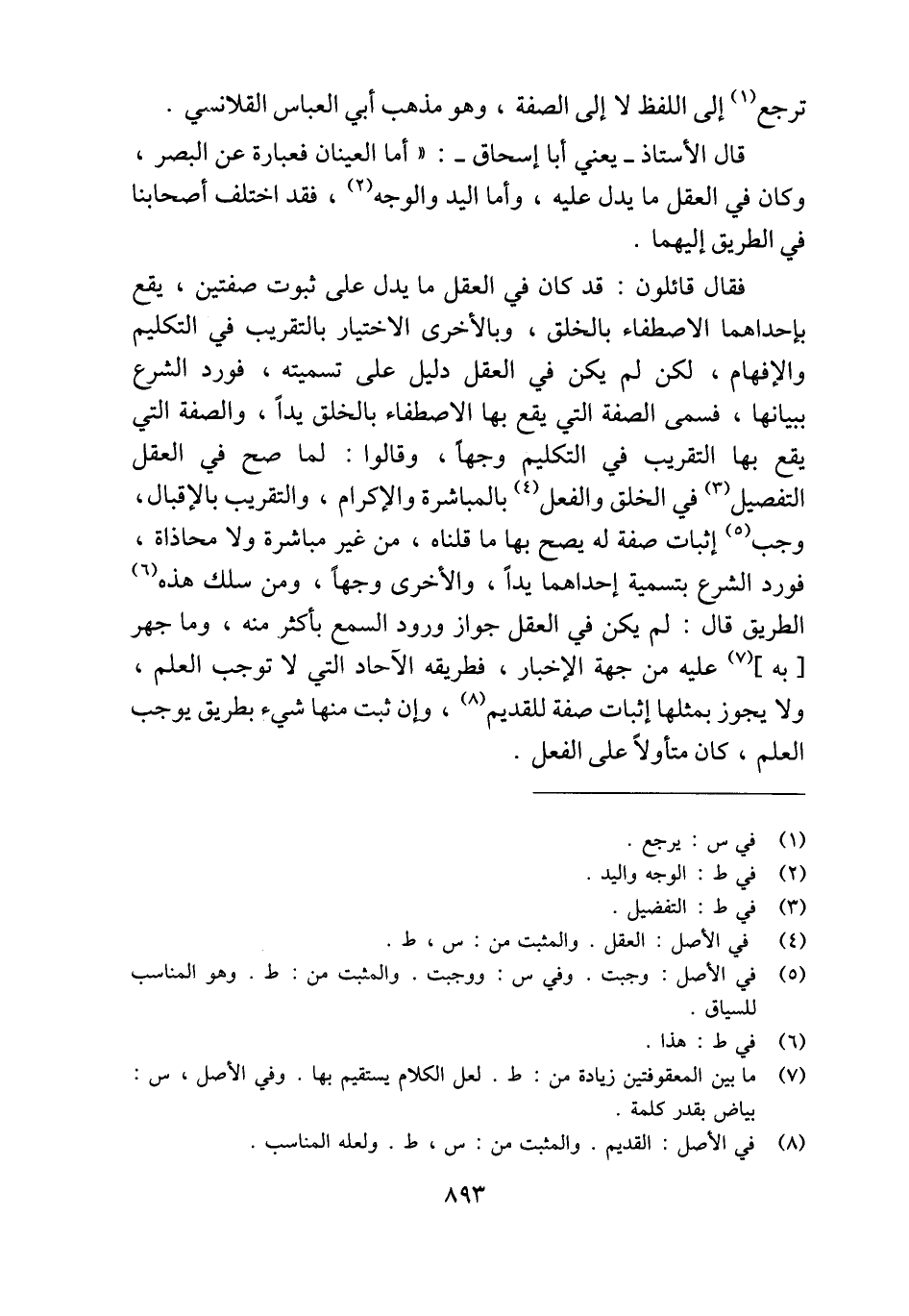 قال الأستاذ -يعني أبا إسحاق-: "أما العينان فعبارة عن البصر، وكان في العقل ما يدل عليه، وأما اليد والوجه (¬2)، فقد اختلف أصحابنا في الطريق إليهما.