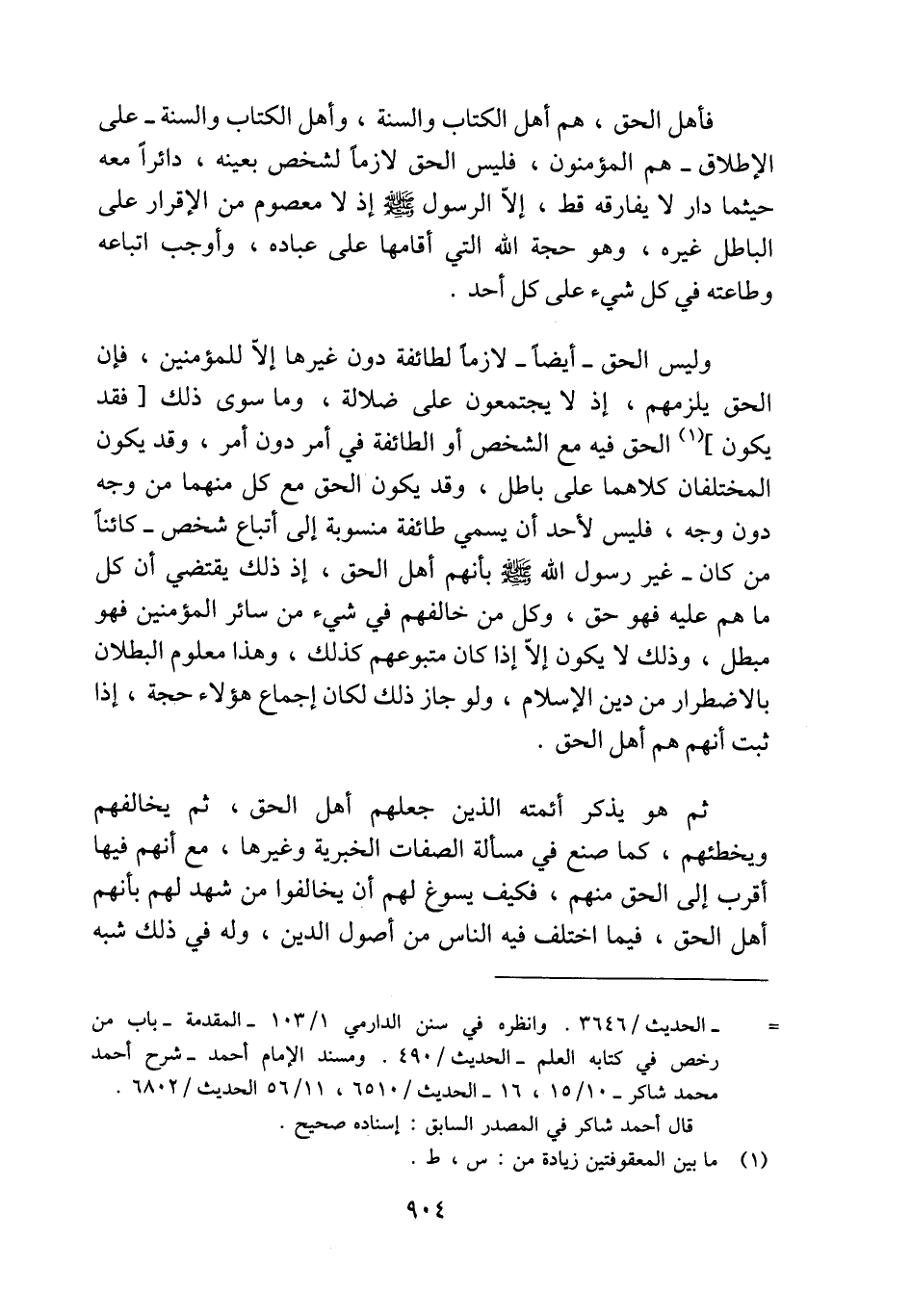 فأهل الحق، هم أهل الكتاب والسنة، وأهل الكتاب والسنة -على الإطلاق- هم المؤمنون، فليس الحق لازمًا لشخص بعينه، دائرًا معه حيثما دار لا يفارقه قط، إلّا الرسول - صلى الله عليه وسلم - إذ لا معصوم من الإقرار على الباطل غيره، وهو حجة الله التي أقامها على عباده، وأوجب اتباعه وطاعته في كل شيء على كل أحد.