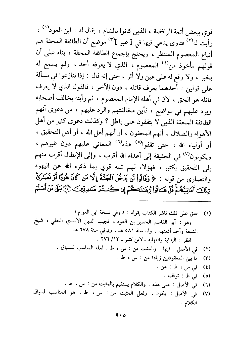 قوي ببعض أئمة الرافضة، الذين كانوا بالشام، يقال له: ابن العود (¬1)، رأيت له (¬2) فتاوى يدعي فيها في [غير] (¬3) موضع أن الطائفة المحقة هم أتباع المعصوم المنتظر، ويحتج بإجماع الطائفة المحقة، بناء على أن قولهم مأخوذ من (¬4) المعصوم، الذي لا يعرفه أحد، ولم يسمع له بخبر، ولا وقع له على عين ولا أثر، حتى إنه قال: إذا تنازعوا في مسألة على قولين: أحدهما يعرف قائله، دون الآخر، فالقول الذي لا يعرف قائله هو الحق، لأن في أهله الإمام المعصوم، ثم رأيته يخالف أصحابه ويرد عليهم في مواضع، فأين مخالفتهم والرد عليهم، من دعوى أنهم الطائفة المحقة الذين لا يتفقون على باطل؟ وكذلك دعوى كثير من أهل الأهواء والضلال، أنهم المحقون، أو أنهم أهل الله، أو أهل التحقيق، أو أولياء الله، حتى تقفوا (¬5) هذه (¬6) المعاني عليهم دون غيرهم، ويكونون (¬7) في الحقيقة إلى أعداء الله أقرب، وإلى الإبطال أقرب منهم إلى التحقيق بكثير، فهؤلاء لهم شبه قوي بما ذكره الله عن اليهود والنصارى من قوله: {وَقَالُوا لَنْ يَدْخُلَ الْجَنَّةَ إلا مَنْ كَانَ هُودًا أَوْ نَصَارَى تِلْكَ أَمَانِيُّهُمْ قُلْ هَاتُوا بُرْهَانَكُمْ إِنْ كُنْتُمْ صَادِقِينَ (111) بَلَى مَنْ أَسْلَمَ