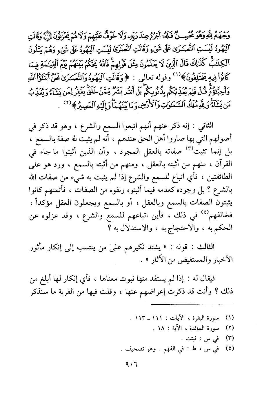 الثاني: إنه ذكر عنهم أنهم اتبعوا السمع والشرع، وهو قد ذكر في أصولهم التي بها صاروا أهل الحق عندهم، أنه لم يثبت لله صفة بالسمع، بل إنما تثبت (¬3) صفاته بالعقل المجرد، وأن الذين أثبتوا ما جاء في القرآن، منهم من أثبته بالعقل، ومنهم من أثبته بالسمع، ورد هو على الطائفتين، فأي اتباع للسمع والشرع إذا لم يثبت به شيء من صفات الله بالشرع؟ بل وجوده كعدمه فيما أثبتوه ونفوه من الصفات، فأئمتهم كانوا يثبتون الصفات بالسمع وبالعقل، أو بالسمع ويجعلون العقل مؤكدًا، فخالفهم (¬4) في ذلك، فأين اتباعهم للسمع والشرع، وقد عزلوه عن الحكم به، والاحتجاج به، والاستدلال به؟