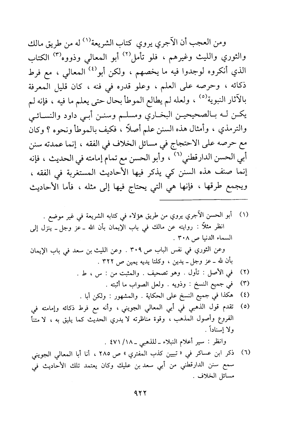 ومن العجب أن الآجري يروي كتاب الشريعة (¬1) له من طريق مالك والثوري والليث وغيوهم، فلو تأمل (¬2) أبو المعالي وذووه (¬3) الكتاب الذي أنكروه لوجدوا فيه ما يخصمهم، ولكن أبو (¬4) المعالي، مع فرط ذكائه، وحرصه على العلم، وعلو قدره في فنه، كان قليل المعرفة بالآثار النبوية (¬5)، ولعله لم يطالع الموطأ بحال حتى يعلم ما فيه، فإنه لم يكن له بالصحيحين البخاري ومسلم وسنن أبي داود والنسائي والترمذي، وأمثال هذه السنن علم أصلًا، فكيف بالموطأ ونحوه؟ وكان مع حرصه على الاحتجاج في مسائل الخلاف في الفقه، إنما عمدته سنن أبي الحسن الدارقطني (¬6)، وأبو الحسن مع تمام إمامته في الحديث، فإنه إنما صنف هذه السنن كي يذكر فيها الأحاديث المستغربة في الفقه، ويجمع طرقها، فإنها هي التي يحتاج فيها إلى مثله، فأما الأحاديث