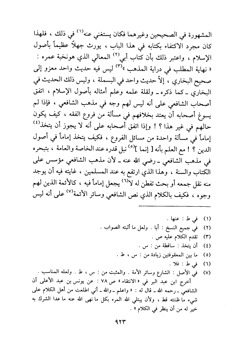 المشهورة في الصحيحين وغيرهما فكان يستغني عنه (¬1) في ذلك، فلهذا كان مجرد الاكتفاء بكتابه في هذا الباب، يورث جهلًا عظيمًا بأصول الإسلام، واعتبر ذلك بأن كتاب أبي (¬2) المعالي الذي هو نخبة عمره: "نهاية المطلب في دراية المذهب" (¬3) ليس فيه حديث واحد معزو إلى صحيح البخاري، إلّا حديث واحد في البسملة، وليس ذلك الحديث في البخاري -كما ذكره- ولقلة علمه وعلم أمثاله بأصول الإسلام، اتفق أصحاب الشافعي على أنه ليس لهم وجه في مذهب الشافعي، فإذا لم يسوغ أصحابه أن يعتد بخلافهم في مسألة من فروع الفقه، كيف يكون حالهم في غير هذا؟! وإذا اتفق أصحابه على أنه لا يجوز أن يتخذ (¬4) إمامًا في مسألة واحدة من مسائل الفروع، فكيف يتخذ إمامًا في أصول الدين؟! مع العلم بأنه [إنما] (¬5) نبل قدره عند الخاصة والعامة، بتبحره في مذهب الشافعي - رضي الله عنه - لأن مذهب الشافعي مؤسس على الكتاب والسنة، وهذا الذي ارتفع به عند المسلمين، غايته فيه أن يوجد منه نقل جمعه أو بحث تفطن له لا (¬6) يجعل إمامًا فيه، كالأئمة الذين لهم وجوه، فكيف بالكلام الذي نص الشافعي وسائر الأئمة (¬7) على أنه ليس
