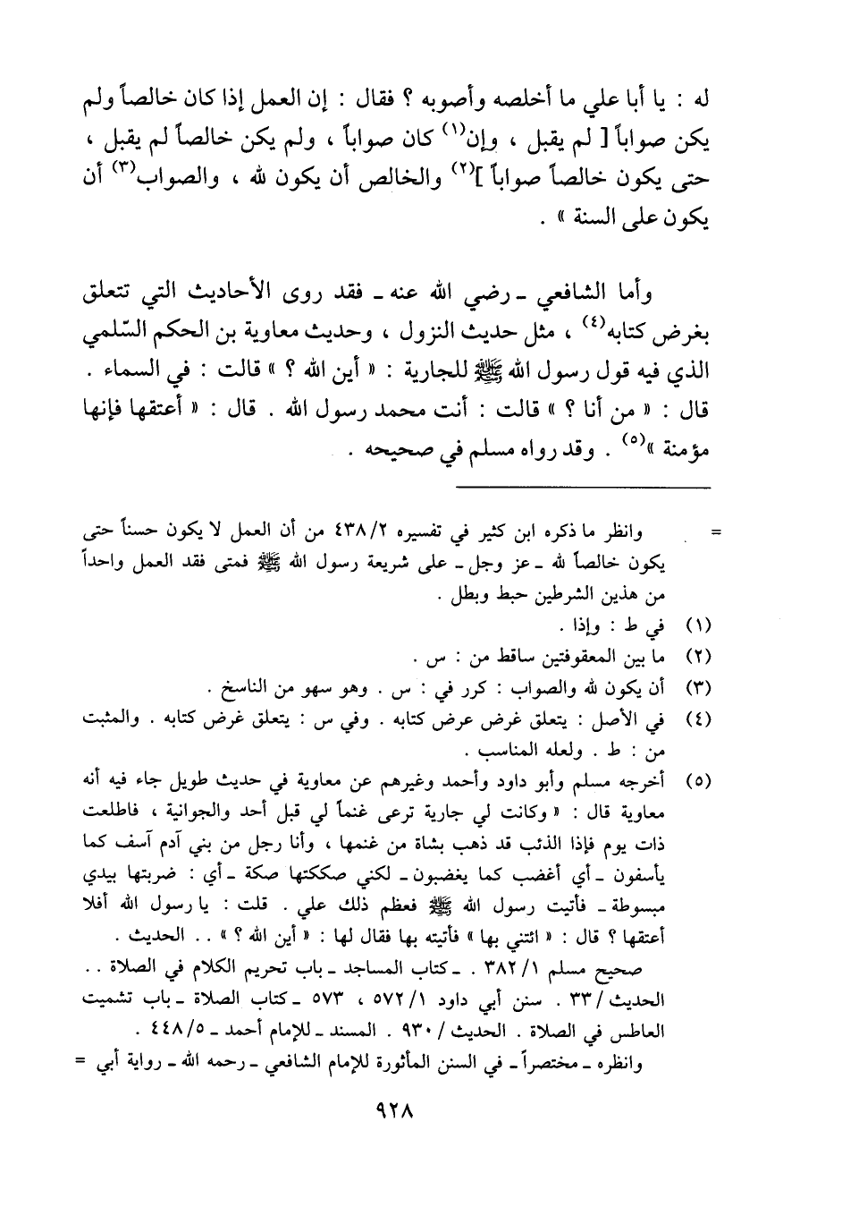 وأما الشافعي - رضي الله عنه - فقد روى الأحاديث التي تتعلق بغرض كتابه (¬4)، مثل حديث النزول، وحديث معاوية بن الحكم السّلمي الذي فيه قول رسول الله - صلى الله عليه وسلم - للجارية: "أين الله؟ " قالت: في السماء. قال: "من أنا؟ " قالت: أنت محمد رسول الله. قال: "أعتقها فإنها مؤمنة" (¬5). وقد رواه مسلم في صحيحه.