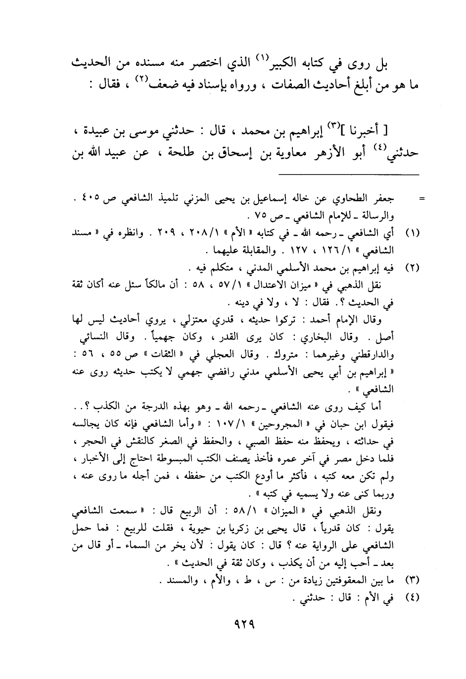 وقال الإمام أحمد: تركوا حديثه، قدري معتزلي، يروي أحاديث ليس لها أصل. وقال البخاري: كان يرى القدر، وكان جهميًّا. وقال النسائي والدارقطني وغيرهما: متروك. وقال العجلي في "الثقات" ص: 55، 56: "إبراهيم بن أبي يحيى الأسلمي مدني رافضي جهمي لا يكتب حديثه روى عنه الشافعي".