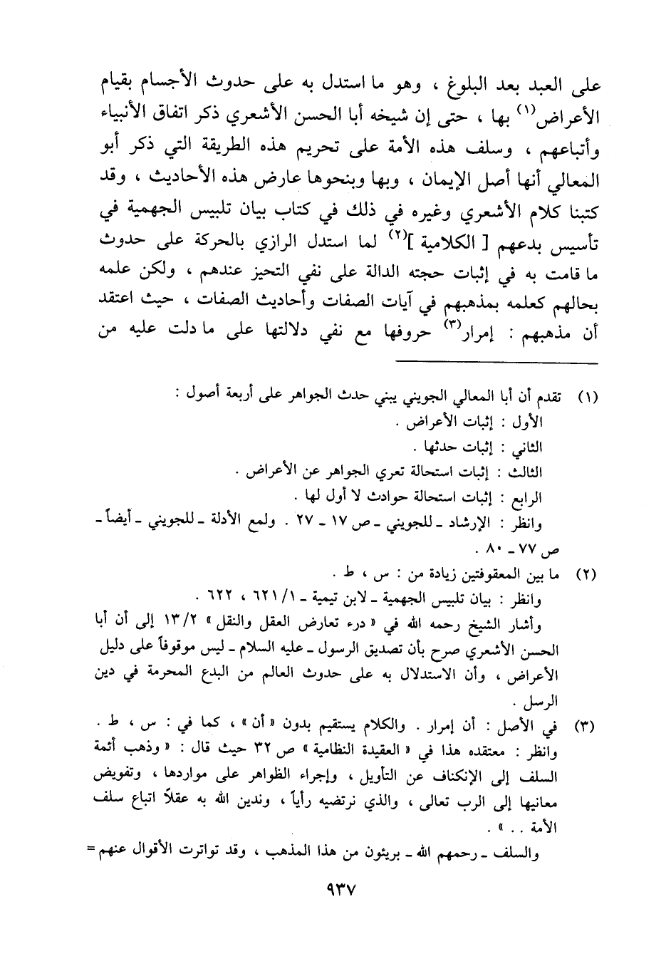 على العبد بعد البلوغ، وهو ما استدل به على حدوث الأجسام بقيام الأعراض (¬1) بها، حتى إن شيخه أبا الحسن الأشعري ذكر اتفاق الأنبياء وأتباعهم، وسلف هذه الأمة على تحريم هذه الطريقة التي ذكر أبو المعالي أنها أصل الإيمان، وبها وبنحوها عارض هذه الأحاديث، وقد كتبنا كلام الأشعري وغيره في ذلك في كتاب بيان تلبيس الجهمية في تأسيس بدعهم [الكلامية] (¬2) لما استدل الرازي بالحركة على حدوث ما قامت به في إثبات حجته الدالة على نفي التحيز عندهم، ولكن علمه بحالهم كعلمه بمذهبهم في آيات الصفات وأحاديث الصفات، حيث اعتقد أن مذهبهم: إمرار (¬3) حروفها مع نفي دلالتها على ما دلت عليه من