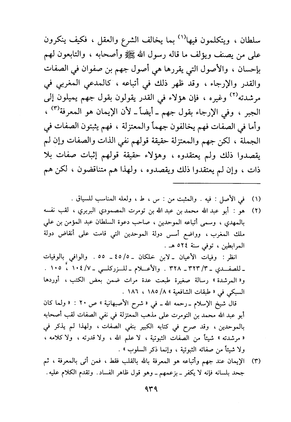 سلطان، ويتكلمون فيها (¬1) بما يخالف الشرع والعقل، فكيف ينكرون على من يصنف ويؤلف ما قاله رسول الله - صلى الله عليه وسلم - وأصحابه، والتابعون لهم بإحسان، والأصول التي يقررها هي أصول جهم بن صفوان في الصفات والقدر والإرجاء، وقد ظهر ذلك في أتباعه، كالمدعي المغربي في مرشدته (¬2) وغيره، فإن هؤلاء في القدر يقولون بقول جهم يميلون إلى الجبر، وفي الإرجاء بقول جهم -أيضًا- لأن الإيمان هو المعرفة (¬3)، وأما في الصفات فهم يخالفون جهمًا والمعتزلة، فهم يثبتون الصفات في الجملة، لكن جهم والمعتزلة حقيقة قولهم نفي الذات والصفات وإن لم يقصدوا ذلك ولم يعتقدوه، وهؤلاء حقيقة قولهم إثبات صفات بلا ذات، وإن لم يعتقدوا ذلك ويقصدوه، ولهذا هم متناقضون، لكن هم