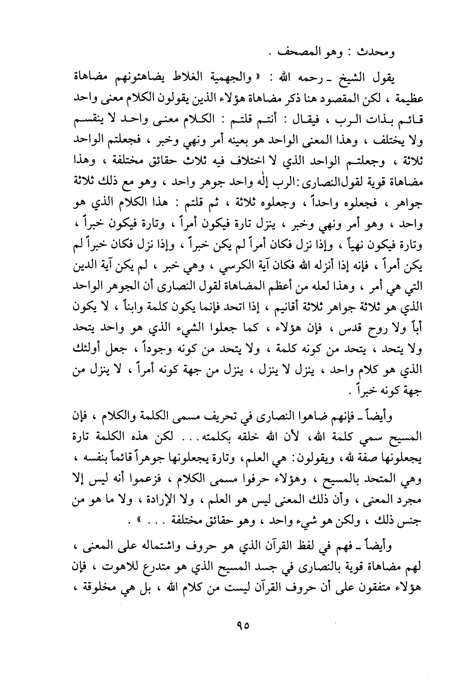 يقول الشيخ -رحمه الله-: "والجهمية الغلاط يضاهئونهم مضاهاة عظيمة، لكن المقصود هنا ذكر مضاهاة هؤلاء الذين يقولون الكلام معنى واحد قائم بذات الرب، فيقال: أنتم قلتم: الكلام معنى واحد لا ينقسم ولا يختلف، وهذا المعنى الواحد هو بعينه أمر ونهي وخبر، فجعلتم الواحد ثلاثة، وجعلتم الواحد الذي لا اختلاف فيه ثلاث حقائق مختلفة، وهذا مضاهاة قوية لقول النصارى: الرب إله واحد جوهر واحد، وهو مع ذلك ثلاثة جواهر، فجعلوه واحدًا، وجعلوه ثلاثة، ثم قلتم: هذا الكلام الذي هو واحد، وهو أمر ونهي وخبر، ينزل تارة فيكون أمرًا، وتارة فيكون خبرًا، وتارة فيكون نهيًا، وإذا نزل فكان أمرًا لم يكن خبرًا، وإذا نزل فكان خبرًا لم يكن أمرًا، فإنه إذا أنزله الله فكان آية الكرسي، وهي خبر، لم يكن آية الدين التي هي أمر، وهذا لعله من أعظم المضاهاة لقول النصارى أن الجوهر الواحد الذي هو ثلاثة جواهر ثلاثة أقانيم، إذا اتحد فإنما يكون كلمة وابنًا، لا يكون أبًا ولا روح قدس، فإن هؤلاء، كما جعلوا الشيء الذي هو واحد يتحد ولا يتحد، يتحد من كونه كلمة، ولا يتحد من كونه وجودًا، جعل أولئك الذي هو كلام واحد، ينزل لا ينزل، ينزل من جهة كونه أمرًا، لا ينزل من جهة كونه خبرًا.