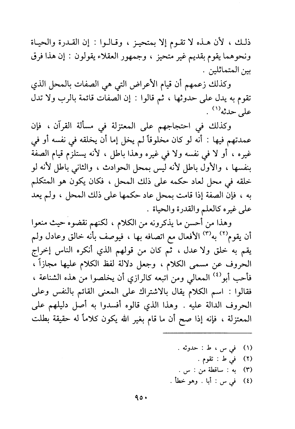 وكذلك زعمهم أن قيام الأعراض التي هي الصفات بالمحل الذي تقوم به يدل على حدوثها، ثم قالوا: إن الصفات قائمة بالرب ولا تدل على حدثه (¬1).