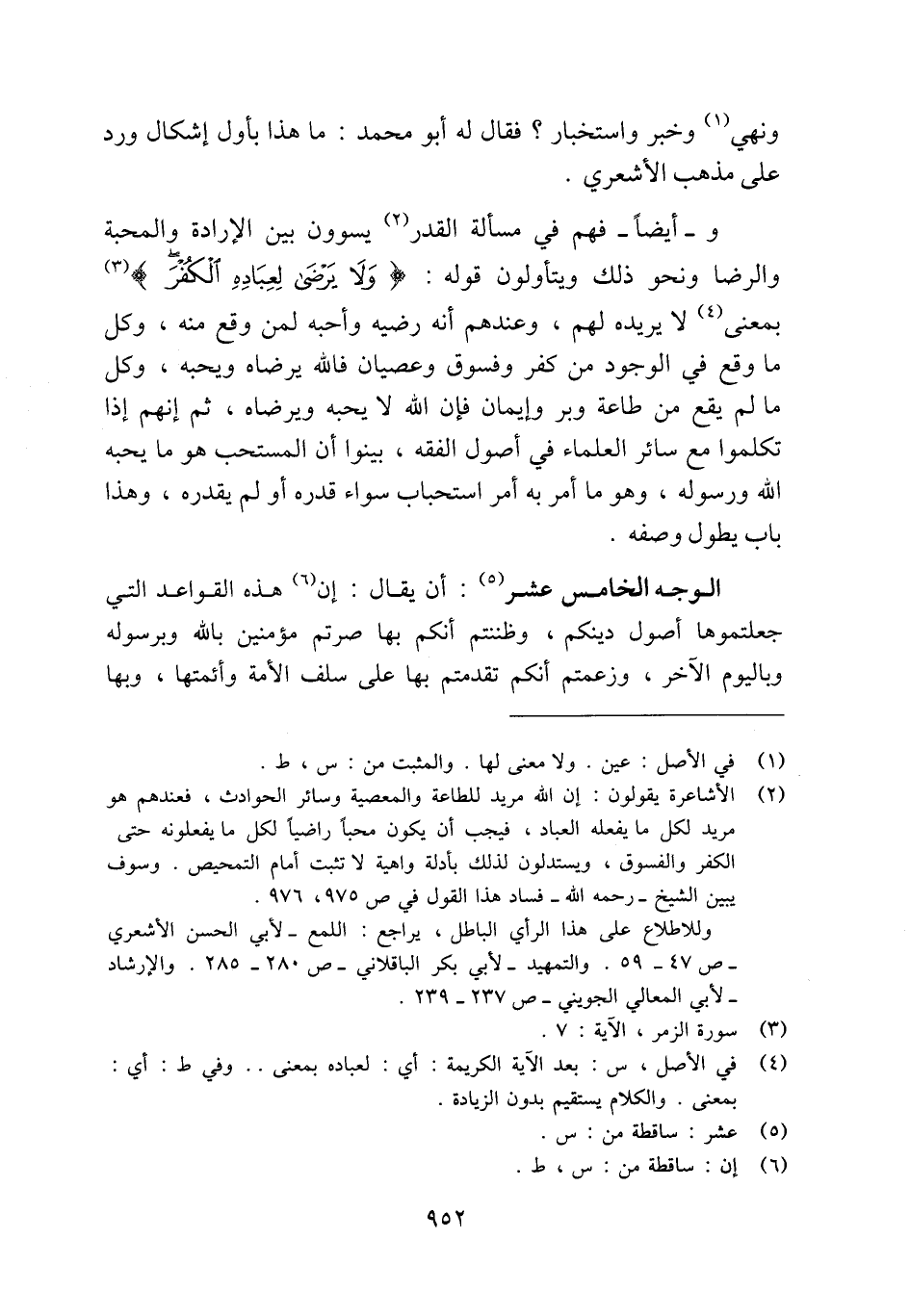 (¬2) الأشاعرة يقولون: إن الله مريد للطاعة والمعصية وسائر الحوادث، فعندهم هو مريد لكل ما يفعله العباد، فيجب أن يكون محبًا راضيًا لكل ما يفعلونه حتى الكفر والفسوق، ويستدلون لذلك بأدلة واهية لا تثبت أمام التمحيص. وسوف يبين الشيخ -رحمه الله- فساد هذا القول في ص: 975، 976.