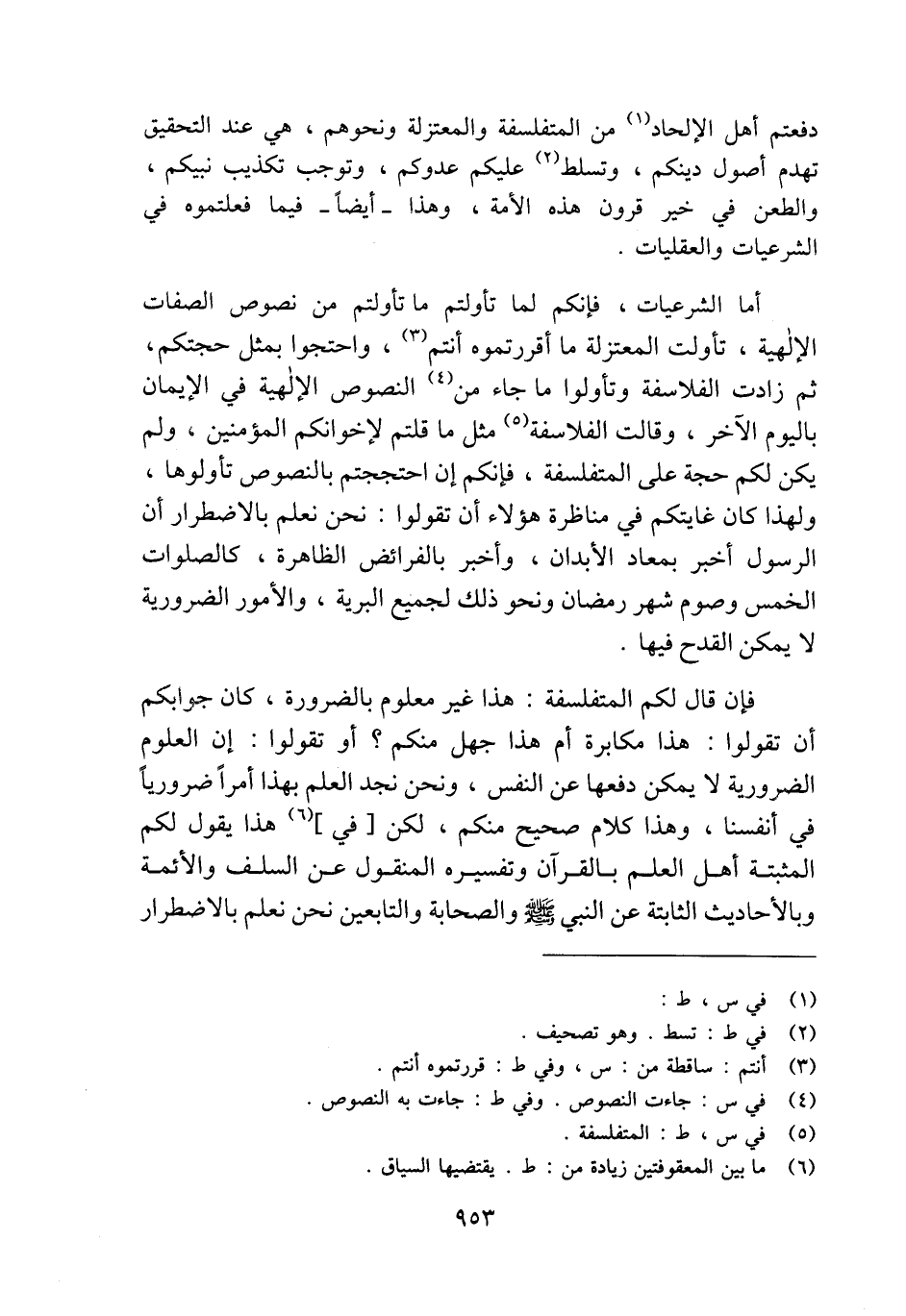 دفعتم أهل الإلحاد (¬1) من المتفلسفة والمعتزلة ونحوهم، هي عند التحقيق تهدم أصول دينكم، وتسلط (¬2) عليكم عدوكم، وتوجب تكذيب نبيكم، والطعن في خير قرون هذه الأمة، وهذا -أيضًا- فيما فعلتموه في الشرعيات والعقليات.