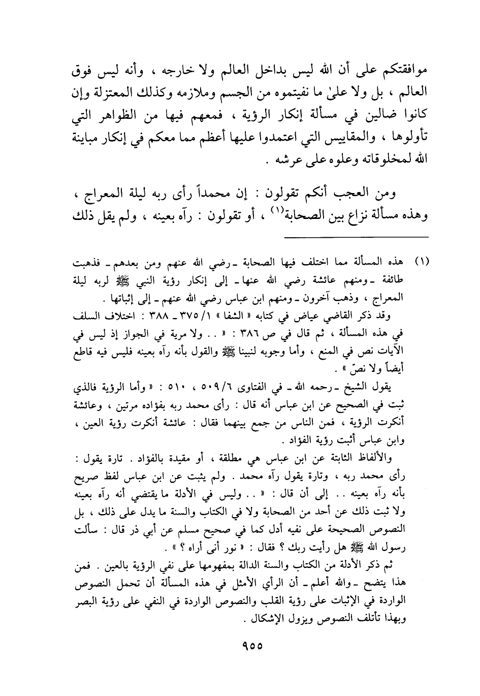 وقد ذكر القاضي عياض في كتابه "الشفا" 1/ 375 - 388: اختلاف السلف في هذه المسألة، ثم قال في ص: 386: ". . ولا مرية في الجواز إذ ليس في الآيات نص في المنع، وأما وجوبه لنبينا - صلى الله عليه وسلم - والقول بأنه رآه بعينه فليس فيه قاطع أيضًا ولا نصّ".