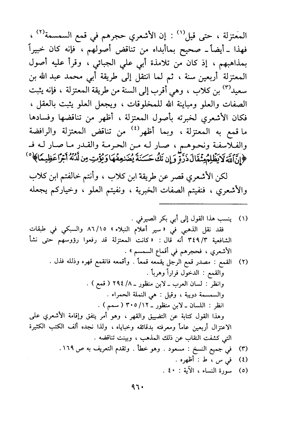 المعتزلة، حتى قيل (¬1): إن الأشعري حجرهم في قمع السمسمة (¬2)، فهذا -أيضًا- صحيح بما أبداه من تناقض أصولهم، فإنه كان خبيرًا بمذاهبهم، إذ كان من تلامذة أبي علي الجبائي، وقرأ عليه أصول المعتزلة أربعين سنة، ثم لما انتقل إلى طريقة أبي محمد عبد الله بن سعيد (¬3) بن كلاب، وهي أقرب إلى السنة من طريقة المعتزلة، فإنه يثبت الصفات والعلو ومباينة الله للمخلوقات، ويجعل العلو يثبت بالعقل، فكان الأشعري لخبرته بأصول المعتزلة، أظهر من تناقضها وفسادها ما قمع به المعتزلة، وبما أظهر (¬4) من تناقض المعتزلة والرافضة والفلاسفة ونحوه، صار له من الحرمة والقدر ما صار له فـ {إِنَّ اللَّهَ لَا يَظْلِمُ مِثْقَالَ ذَرَّةٍ وَإِنْ تَكُ حَسَنَةً يُضَاعِفْهَا وَيُؤْتِ مِنْ لَدُنْهُ أَجْرًا عَظِيمًا} (¬5). لكن الأشعري قصر عن طريقة ابن كلاب، وأنتم خالفتم ابن كلاب والأشعري، فنفيتم الصفات الخبرية، ونفيتم العلو، وخياركم يجعله