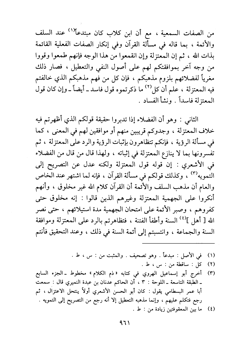 من الصفات السمعية، مع أن ابن كلاب كان مبتدعًا (¬1) عند السلف والأئمة، بما قاله في مسألة القرآن وفي إنكار الصفات الفعلية القائمة بذات الله، ثم إن المعتزلة وإن انقمعوا من هذا الوجه فإنهم طمعوا وقووا من وجه آخر بموافقتكم لهم على أصول النفي والتعطيل، فصار ذلك مغريًا لفضلائهم بلزوم مذهبكم، فإن كل من فهم مذهبكم الذي خالفتم فيه المعتزلة، علم أن كل (¬2) ما ذكرتموه قول فاسد -أيضًا- وإن كان قول المعتزلة فاسدًا. ونشأ الفساد.