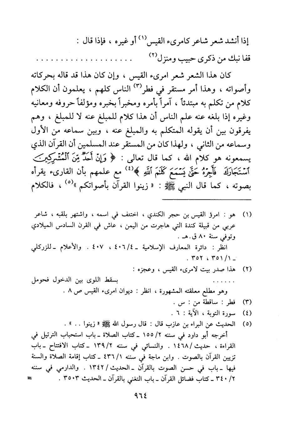 كان هذا الشعر شعر امرئ القيس، وإن كان هذا قد قاله بحركاته وأصواته، وهذا أمر مستقر في فطر (¬3) الناس كلهم، يعلمون أن الكلام كلام من تكلم به مبتدئًا، آمرًا بأمره ومخبرًا بخبره ومؤلفًا حروفه ومعانيه وغيره إذا بلغه عنه علم الناس أن هذا كلام للمبلغ عنه لا للمبلغ، وهم يفرقون بين أن يقوله المتكلم به والمبلغ عنه، وبين سماعه من الأول وسماعه من الثاني، ولهذا كان من المستقر عند المسلمين أن القرآن الذي يسمعونه هو كلام الله، كما قال تعالى: {وَإِنْ أَحَدٌ مِنَ الْمُشْرِكِينَ اسْتَجَارَكَ فَأَجِرْهُ حَتَّى يَسْمَعَ كَلَامَ اللَّهِ} (¬4) مع علمهم بأن القارئ يقرأه بصوته، كما قال النبي - صلى الله عليه وسلم - "زينوا القرآن بأصواتكم" (¬5) , فالكلام
