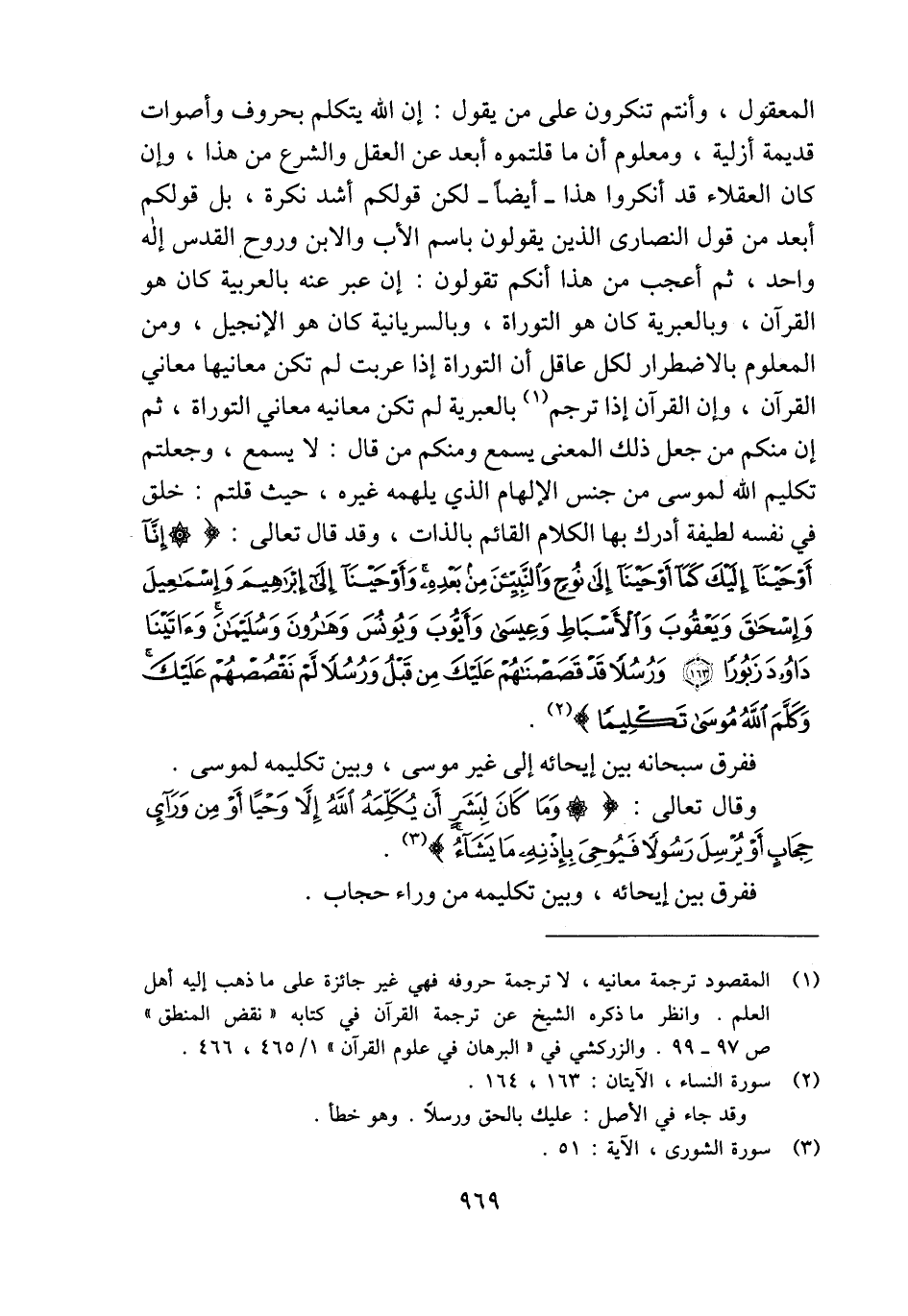 المعقول، وأنتم تنكرون على من يقول: إن الله يتكلم بحروف وأصوات قديمة أزلية، ومعلوم أن ما قلتموه أبعد عن العقل والشرع من هذا، وإن كان العقلاء قد أنكروا هذا -أيضًا- لكن قولكم أشد نكرة، بل قولكم أبعد من قول النصارى الذين يقولون باسم الأب والابن وروح القدس إله واحد، ثم أعجب من هذا أنكم تقولون: إن عبر عنه بالعربية كان هو القرآن، وبالعبرية كان هو التوراة، وبالسريانية كان هو الإنجيل، ومن المعلوم بالاضطرار لكل عاقل أن التوراة إذا عربت لم تكن معانيها معاني القرآن، وإن القرآن إذا ترجم (¬1) بالعبرية لم تكن معانيه معاني التوراة، ثم إن منكم من جعل ذلك المعنى يسمع ومنكم من قال: لا يسمع، وجعلتم تكليم الله لموسى من جنس الإلهام الذي يلهمه غيره، حيث قلتم: خلق في نفسه لطيفة أدرك بها الكلام القائم بالذات، وقد قال تعالى: {إِنَّا أَوْحَيْنَا إِلَيْكَ كَمَا أَوْحَيْنَا إِلَى نُوحٍ وَالنَّبِيِّينَ مِنْ بَعْدِهِ وَأَوْحَيْنَا إِلَى إِبْرَاهِيمَ وَإِسْمَاعِيلَ وَإِسْحَاقَ وَيَعْقُوبَ وَالْأَسْبَاطِ وَعِيسَى وَأَيُّوبَ وَيُونُسَ وَهَارُونَ وَسُلَيْمَانَ وَآتَيْنَا دَاوُودَ زَبُورًا (163) وَرُسُلًا قَدْ قَصَصْنَاهُمْ عَلَيْكَ مِنْ قَبْلُ وَرُسُلًا لَمْ نَقْصُصْهُمْ عَلَيْكَ وَكَلَّمَ اللَّهُ مُوسَى تَكْلِيمًا} (¬2).