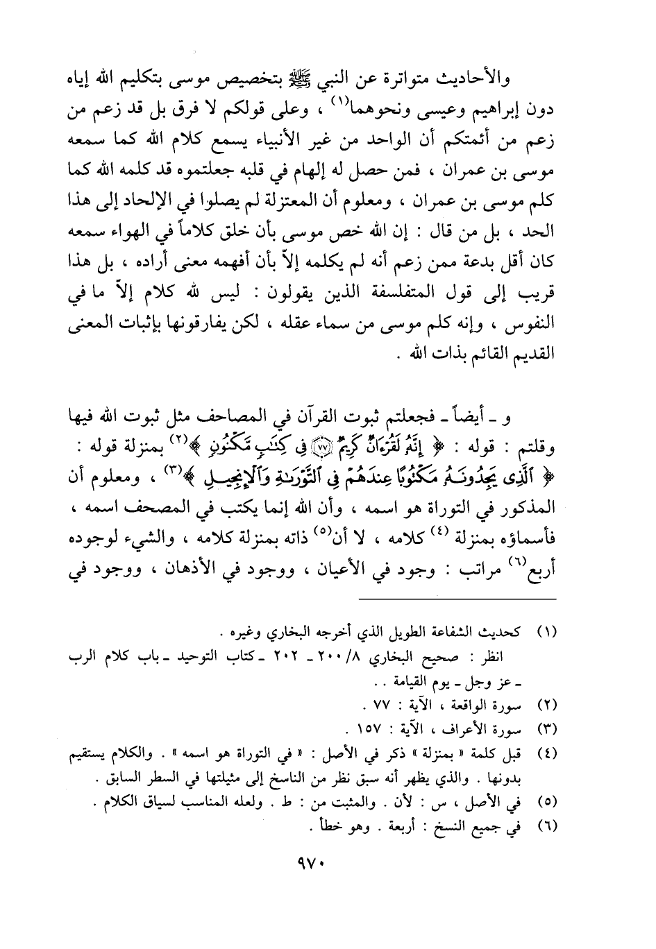 و-أيضًا- فجعلتم ثبوت القرآن في المصاحف مثل ثبوت الله فيها وقلتم: قوله: {إِنَّهُ لَقُرْآنٌ كَرِيمٌ (77) فِي كِتَابٍ مَكْنُونٍ} (¬2) بمنزلة قوله: {الَّذِي يَجِدُونَهُ مَكْتُوبًا عِنْدَهُمْ فِي التَّوْرَاةِ وَالْإِنْجِيلِ} (¬3)، ومعلوم أن المذكور في التوراة هو اسمه، وأن الله إنما يكتب في المصحف اسمه، فأسماؤه بمنزلة (¬4) كلامه، لا أن (¬5) ذاته بمنزلة كلامه، والشيء لوجوده أربع (¬6) مراتب: وجود في الأعيان، ووجود في الأذهان، ووجود في