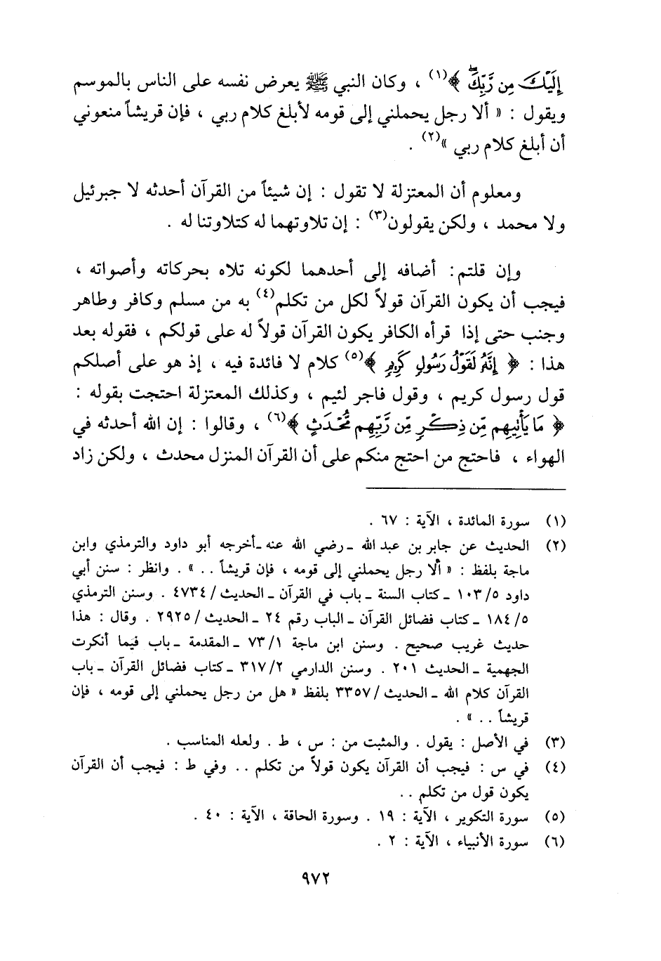 (¬2) الحديث عن جابر بن عبد الله - رضي الله عنه - أخرجه أبو داود والترمذي وابن ماجة بلفظ: "ألا رجل يحملني إلى قومه، فإن قريشًا. . ". وانظر: سنن أبي داود 5/ 103 - كتاب السنة - باب في القرآن- الحديث / 4734. وسنن الترمذي 5/ 184 - كتاب فضائل القرآن- الباب رقم 24 - الحديث / 2925. وقال: هذا حديث غريب صحيح. وسنن ابن ماجة 1/ 73 - المقدمة- باب فيما أنكرت الجهمية - الحديث 201. وسنن الدارمي 2/ 317 - كتاب فضائل القرآن- باب القرآن كلام الله - الحديث / 3357 بلفظ "هل من رجل يحملني إلى قومه، فإن قريشًا. . ".