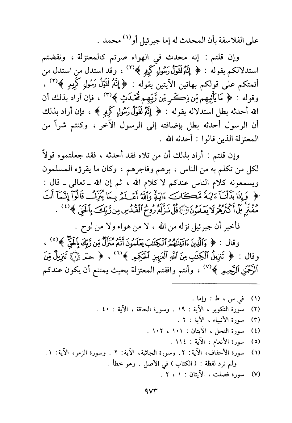 وإن قلتم: إنه محدث في الهواء صرتم كالمعتزلة، ونقضتم استدلالكم بقوله: {إِنَّهُ لَقَوْلُ رَسُولٍ كَرِيمٍ} (¬2)، وقد استدل من استدل من أئمتكم على قولكم بهاتين الآيتين بقوله: {إِنَّهُ لَقَوْلُ رَسُولٍ كَرِيمٍ} (2)، وقوله: {مَا يَأْتِيهِمْ مِنْ ذِكْرٍ مِنْ رَبِّهِمْ مُحْدَثٍ} (¬3)، فإن أراد بذلك أن الله أحدثه بطل استدلاله بقوله: {إِنَّهُ لَقَوْلُ رَسُولٍ كَرِيمٍ}، فإن أراد بذلك أن الرسول أحدثه بطل بإضافته إلى الرسول الآخر، وكنتم شرًّا من المعتزلة الذين قالوا: أحدثه الله.
