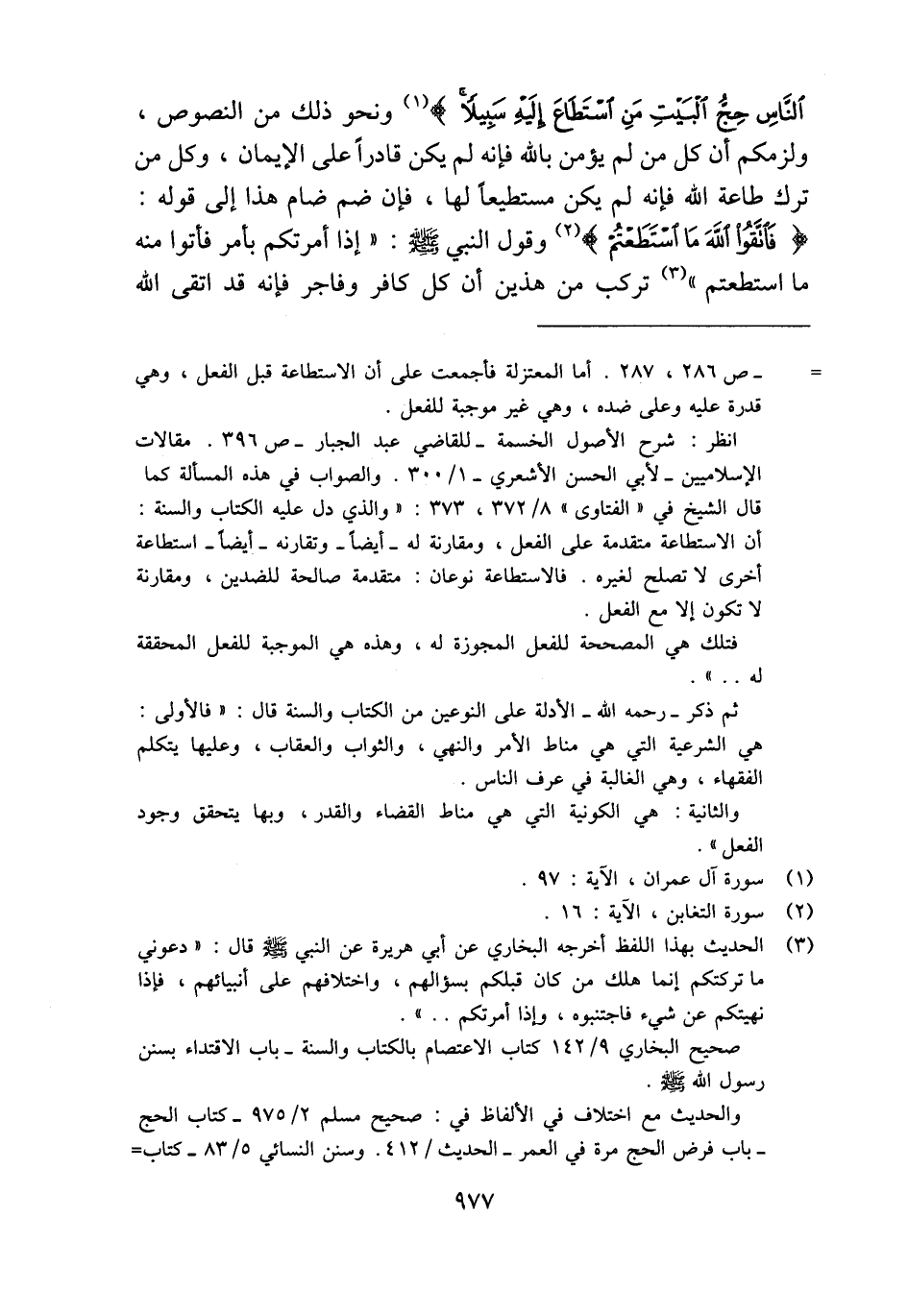 (¬3) الحديث بهذا اللفظ أخرجه البخاري عن أبي هريرة عن النبي - صلى الله عليه وسلم - قال: "دعوني ما تركتكم إنما هلك من كان قبلكم بسؤالهم، واختلافهم على أنبيائهم، فإذا نهيتكم عن شيء فاجتنبوه، وإذا أمرتكم. . ".