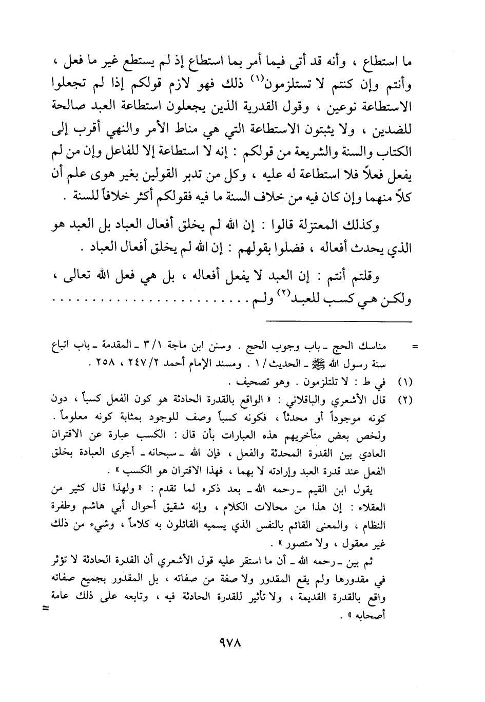 (¬2) قال الأشعري والباقلاني: "الواقع بالقدرة الحادثة هو كون الفعل كسبًا، دون كونه موجودًا أو محدثًا، فكونه كسبًا وصف للوجود بمثابة كونه معلومًا ولخص بعض متأخريهم هذه العبارات بأن قال: الكسب عبارة عن الاقتران العادي بين القدرة المحدثة والفعل، فإن الله - سبحانه - أجرى العبادة بخلق الفعل عند قدرة العبد وإرادته لا بهما، فهذا الاقتران هو الكسب".