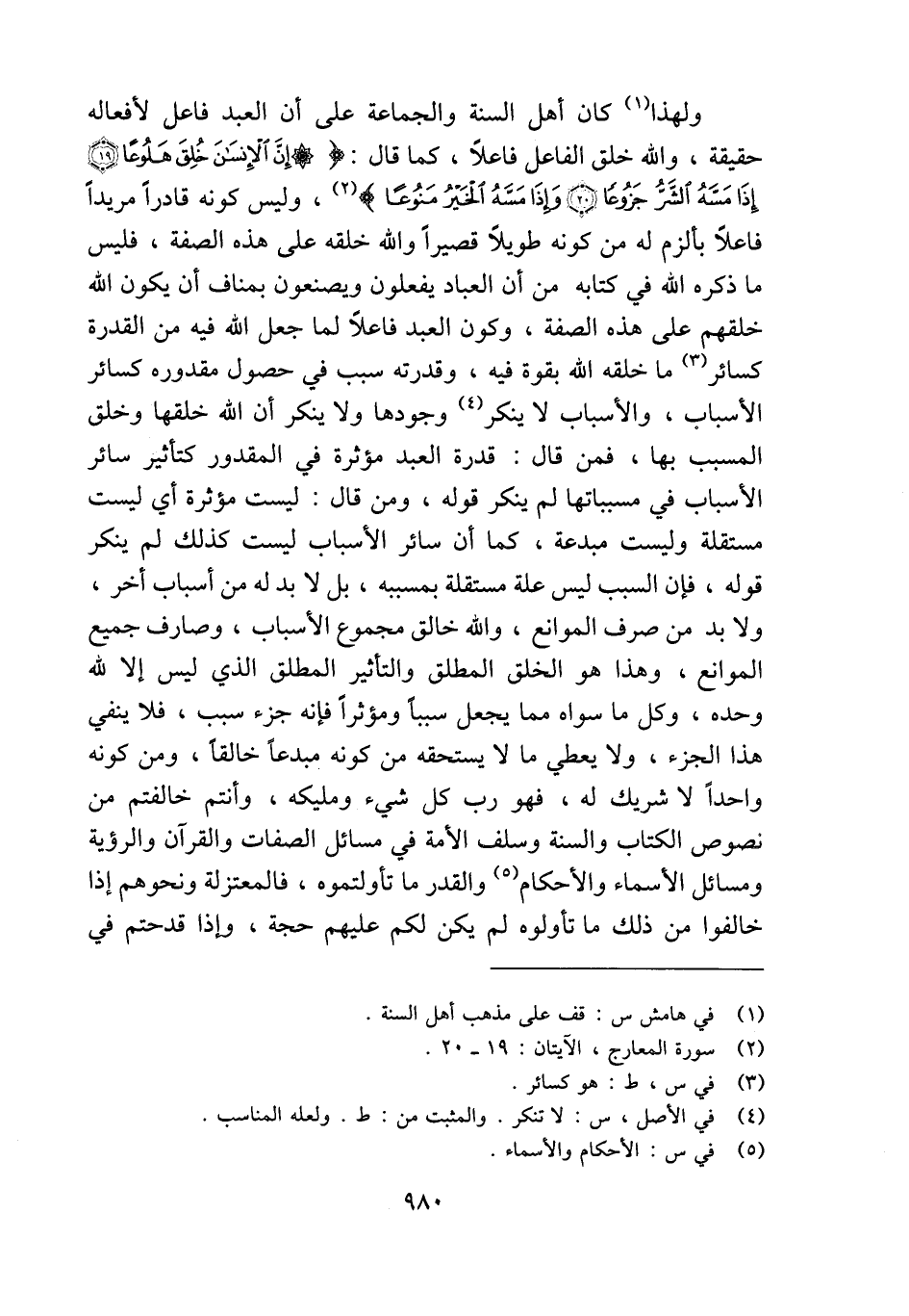 ولهذا (¬1) كان أهل السنة والجماعة على أن العبد فاعل لأفعاله حقيقة، والله خلق الفاعل فاعلًا، كما قال: {إِنَّ الْإِنْسَانَ خُلِقَ هَلُوعًا (19) إِذَا مَسَّهُ الشَّرُّ جَزُوعًا (20) وَإِذَا مَسَّهُ الْخَيْرُ مَنُوعًا} (¬2)، وليس كونه قادرًا مريدًا فاعلًا بألزم له من كونه طويلًا قصيرًا والله خلقه على هذه الصفة، فليس ما ذكره الله في كتابه من أن العباد يفعلون ويصنعون بمناف أن يكون الله خلقهم على هذه الصفة، وكون العبد فاعلًا لما جعل الله فيه من القدرة كسائر (¬3) ما خلقه الله بقوة فيه، وقدرته سبب في حصول مقدوره كسائر الأسباب، والأسباب لا ينكر (¬4) وجودها ولا ينكر أن الله خلقها وخلق المسبب بها، فمن قال: قدرة العبد مؤثرة في المقدور كتأثير سائر الأسباب في مسبباتها لم ينكر قوله، ومن قال: ليست مؤثرة أي ليست مستقلة وليست مبدعة، كما أن سائر الأسباب ليست كذلك لم ينكر قوله، فإن السبب ليس علة مستقلة بمسببه، بل لا بد له من أسباب أخر، ولا بد من صرف الموانع، والله خالق مجموع الأسباب، وصارف جميع الموانع، وهذا هو الخلق المطلق والتأثير المطلق الذي ليس إلا لله وحده، وكل ما سواه مما يجعل سببًا ومؤثرًا فإنه جزء سبب، فلا ينفي هذا الجزء، ولا يعطي ما لا يستحقه من كونه مبدعًا خالقًا، ومن كونه واحدًا لا شريك له، فهو رب كل شيء ومليكه، وأنتم خالفتم من نصوص الكتاب والسنة وسلف الأمة في مسائل الصفات والقرآن والرؤية ومسائل الأسماء والأحكام (¬5) والقدر ما تأولتموه، فالمعتزلة ونحوهم إذا خالفوا من ذلك ما تأولوه لم يكن لكم عليهم حجة، وإذا قدحتم في