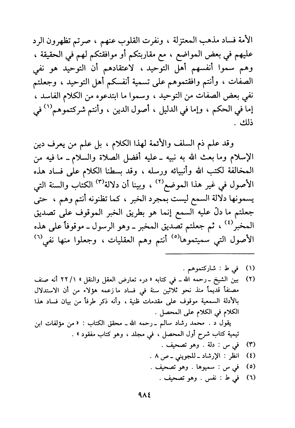 وقد علم ذم السلف والأئمة لهذا الكلام، بل علم من يعرف دين الإسلام وما بعث الله به نبيه -عليه أفضل الصلاة والسلام- ما فيه من المخالفة لكتب الله وأنبيائه ورسله، وقد بسطنا الكلام على فساد هذه الأصول في غير هذا الموضع (¬2)، وبينا أن دلالة (¬3) الكتاب والسنة التي يسمونها دلالة السمع ليست بمجرد الخبر، كما تظنونه أنتم وهم، حتى جعلتم ما دلّ عليه السمع إنما هو بطريق الخبر الموقوف على تصديق المخبر (¬4)، ثم جعلتم تصديق المخبر -وهو الرسول- موقوفًا على هذه الأصول التي سميتموها (¬5) أنتم وهم العقليات، وجعلوا منها نفي (¬6)